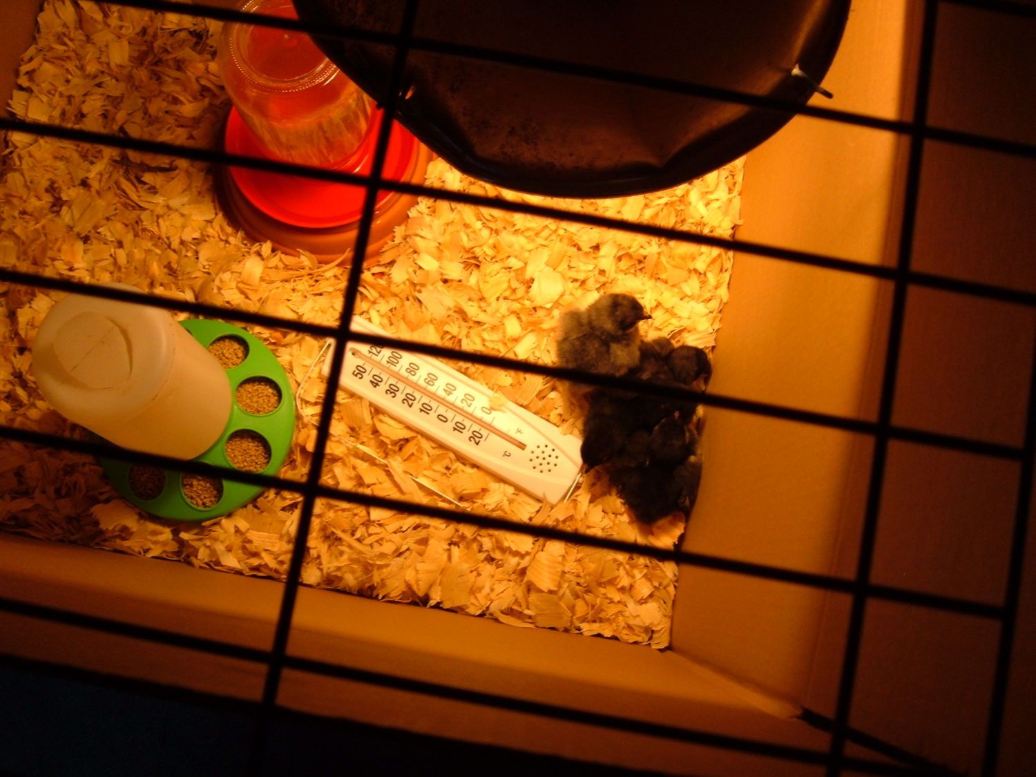 The babies are here. I met Daphne this afternoon & picked up 4 beautiful babies. There are 2 black & 2 blue. I have one loud mouth in the group. They made the ride home just fine & within a few minutes were checking out the new house. They are eating, drinking & pooping pretty much everything chickens do except sleeping yet.