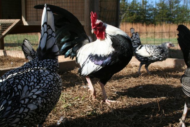 Notice my Light Sussex? She is bigger than the Barred Rock rooster who keeps them all from laying all over the run. LMAO.... below is a close up... I like how the Australorp is in the middle like she is pushing her way forward at a concert. If I touch that gate they go nuts. LMAO Love them.
