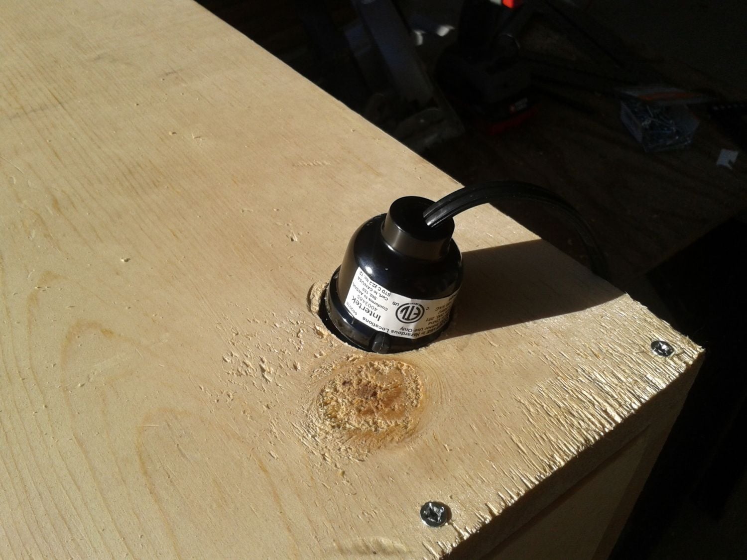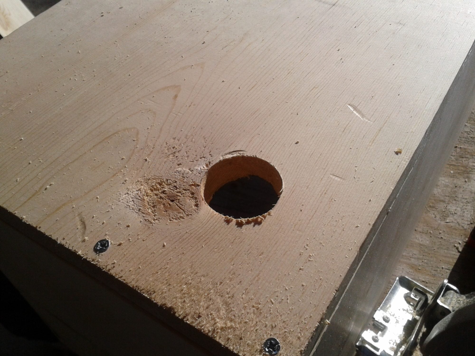 Then we drilled a hold to accomidate a 75w fixture. Make sure your hole is far enough away from the side/back to attach your bell inside.