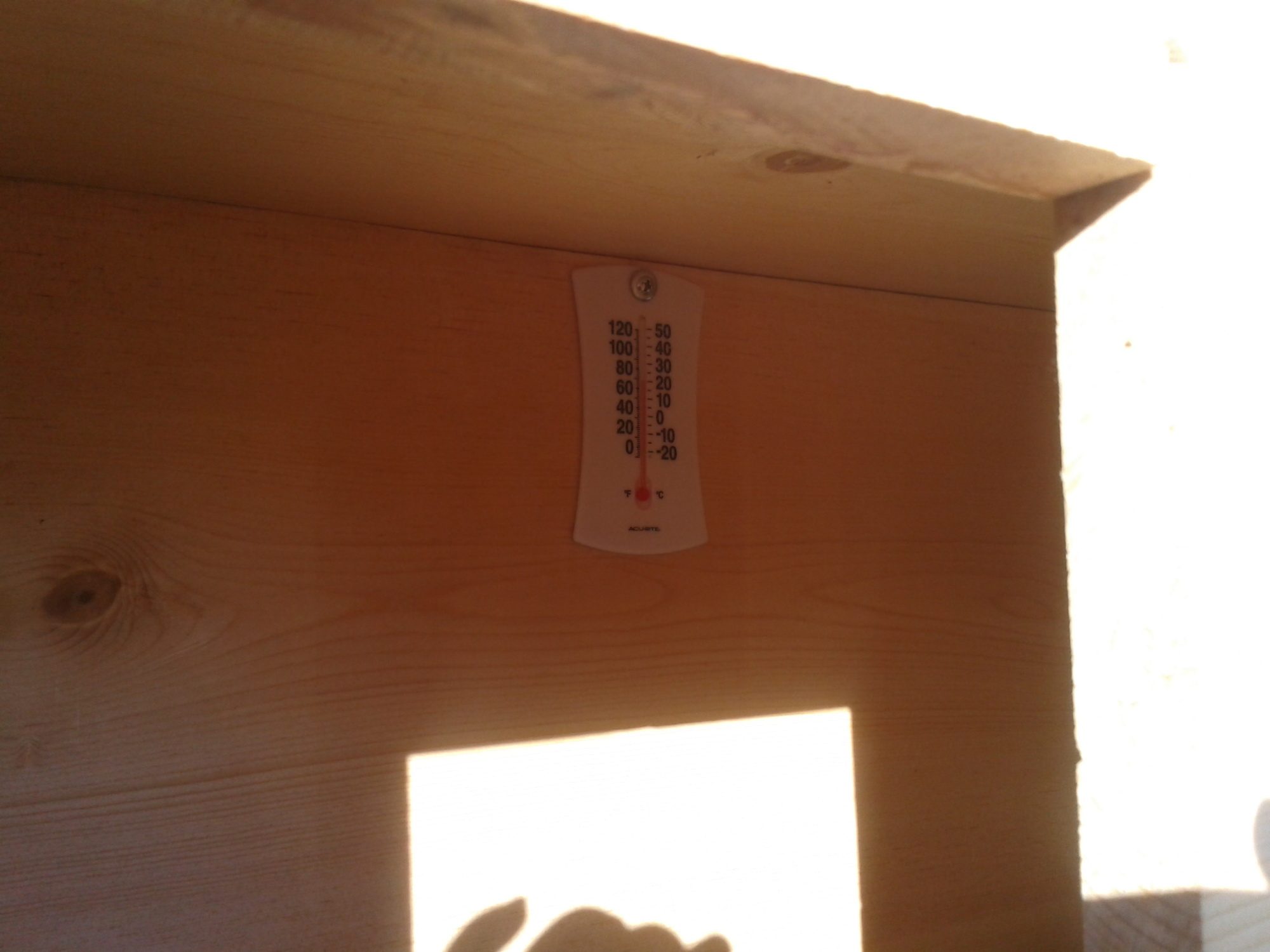 Finished product includes a thermometer inside, just about mid way, so you can see it diagonally from the door.