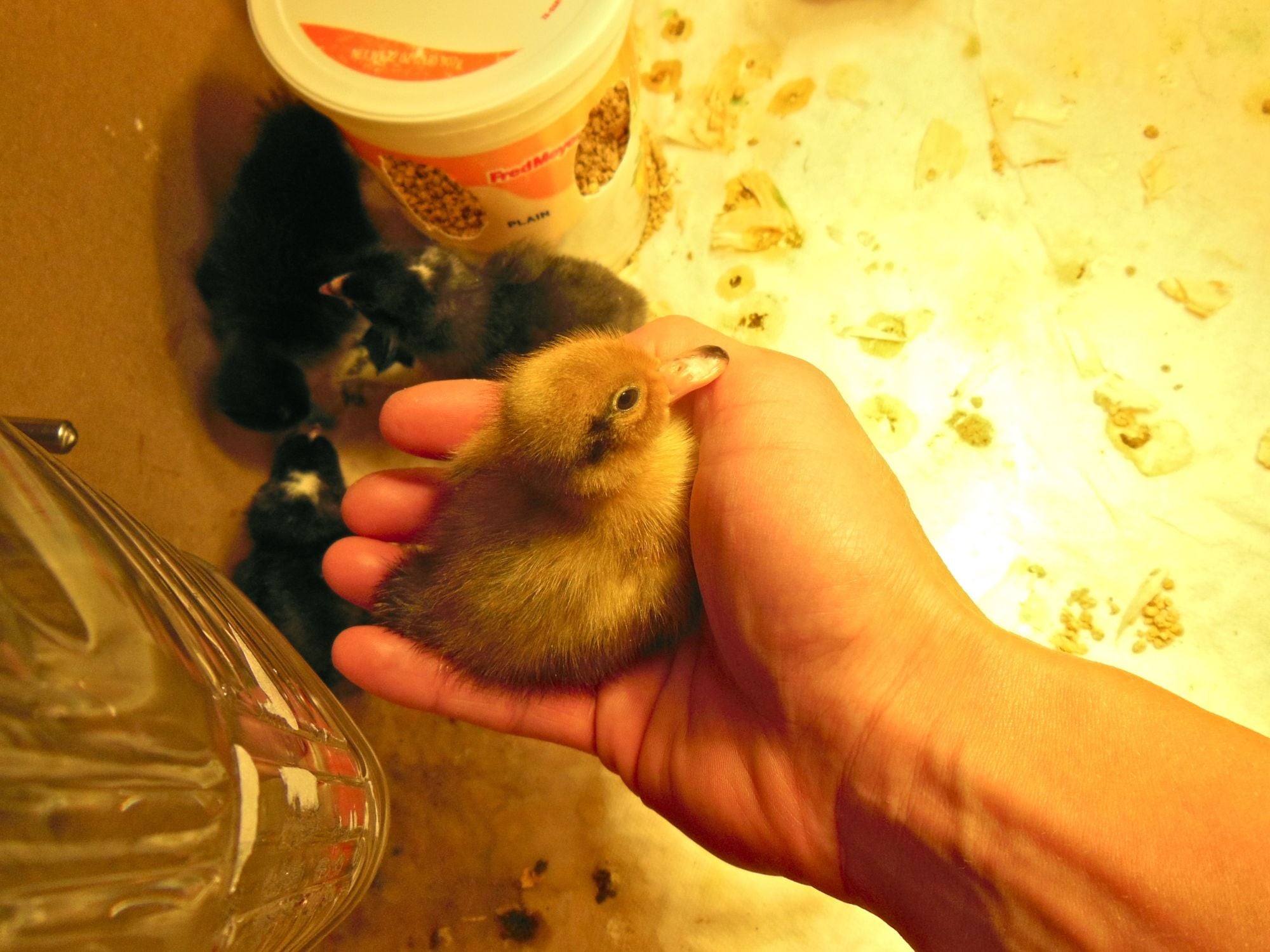 Yesterday we picked up our 5 little female ducks from the post office. Here's a photo of Hazel, the Snowy Mallard because she's the tiniest:
