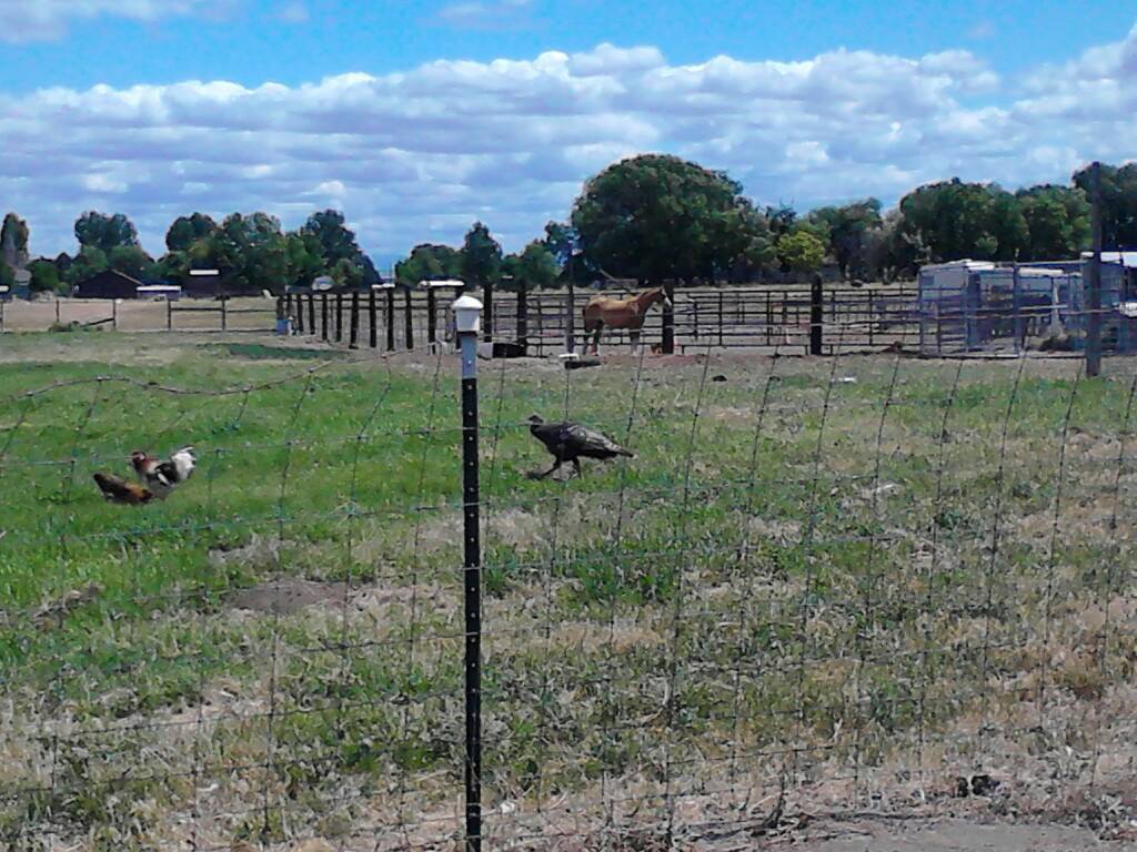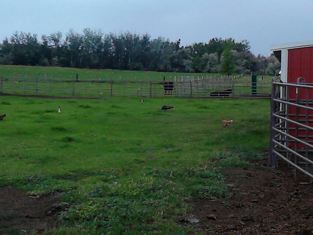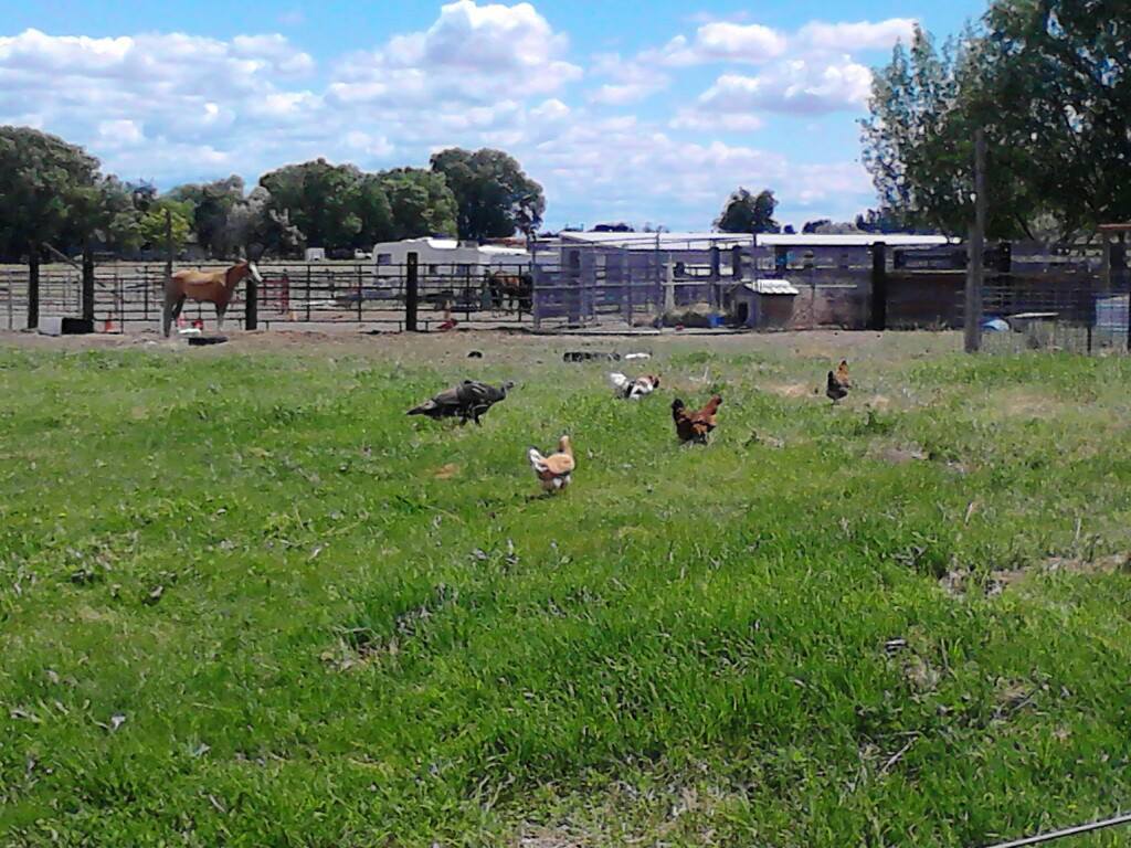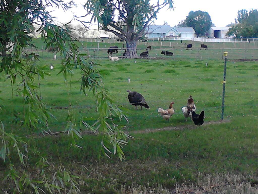 Chucky and my chickens "grazing in the neighbors cattle pasture closer to our house.