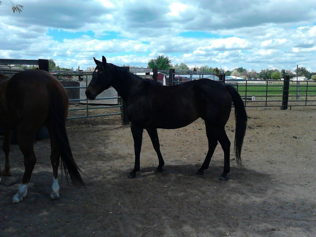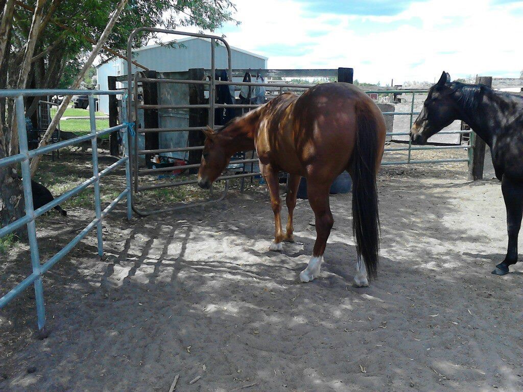 Here is Cowboy, our 3 yr old AQHA keeping a watchful eye on our black lab, Whitney thru the panels. Freckles, our 18yr old AQHA mare is standing next to him. Both are Colonel Freckles bred horses.