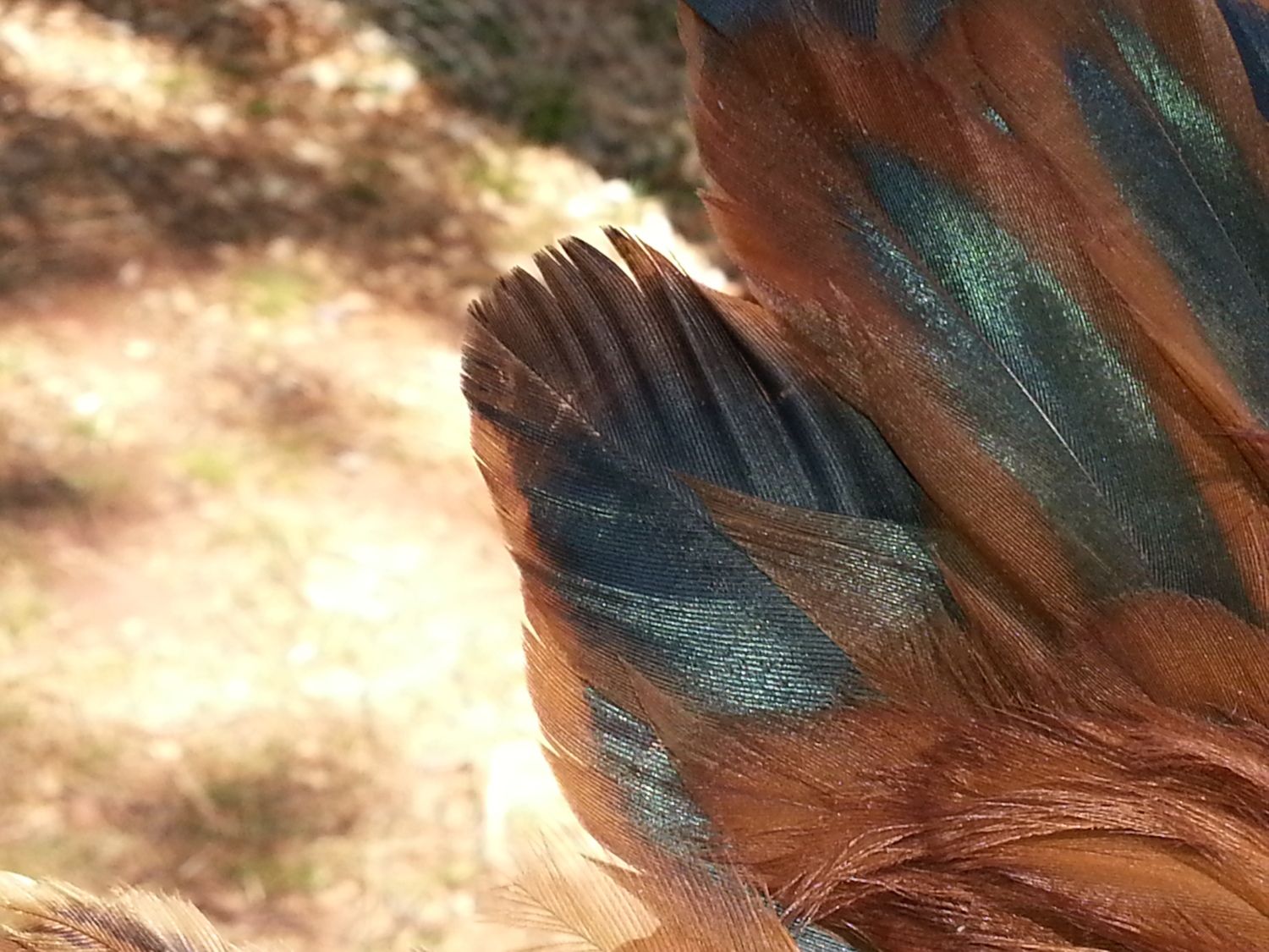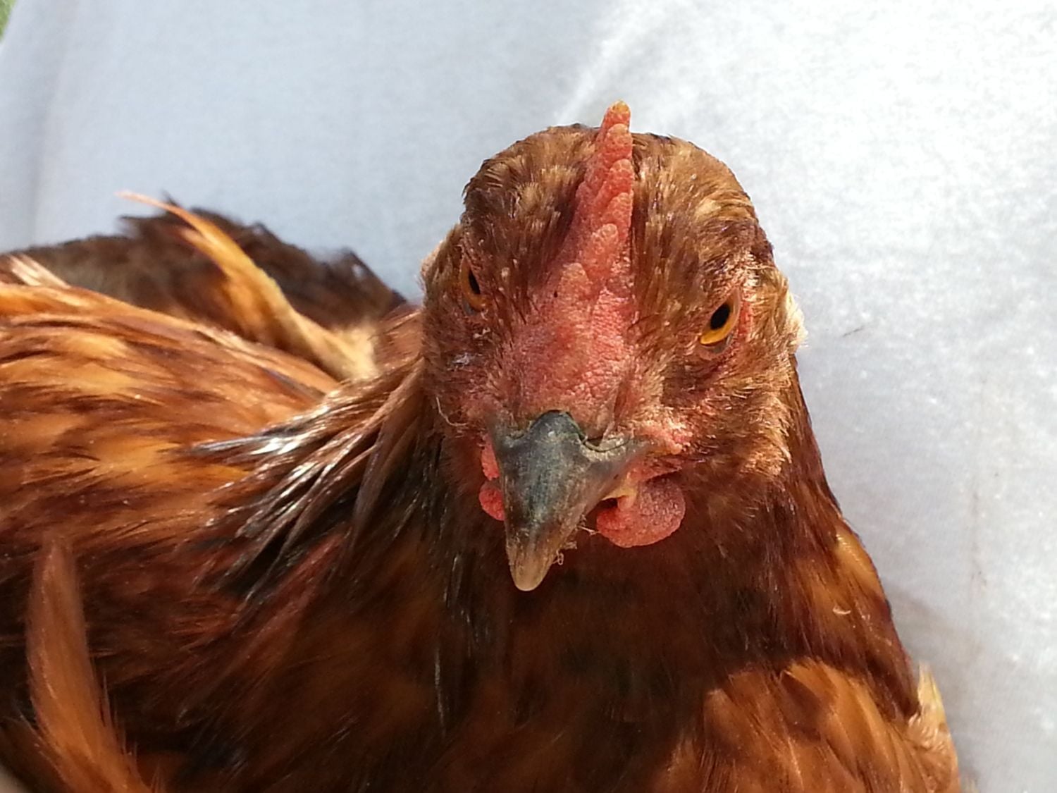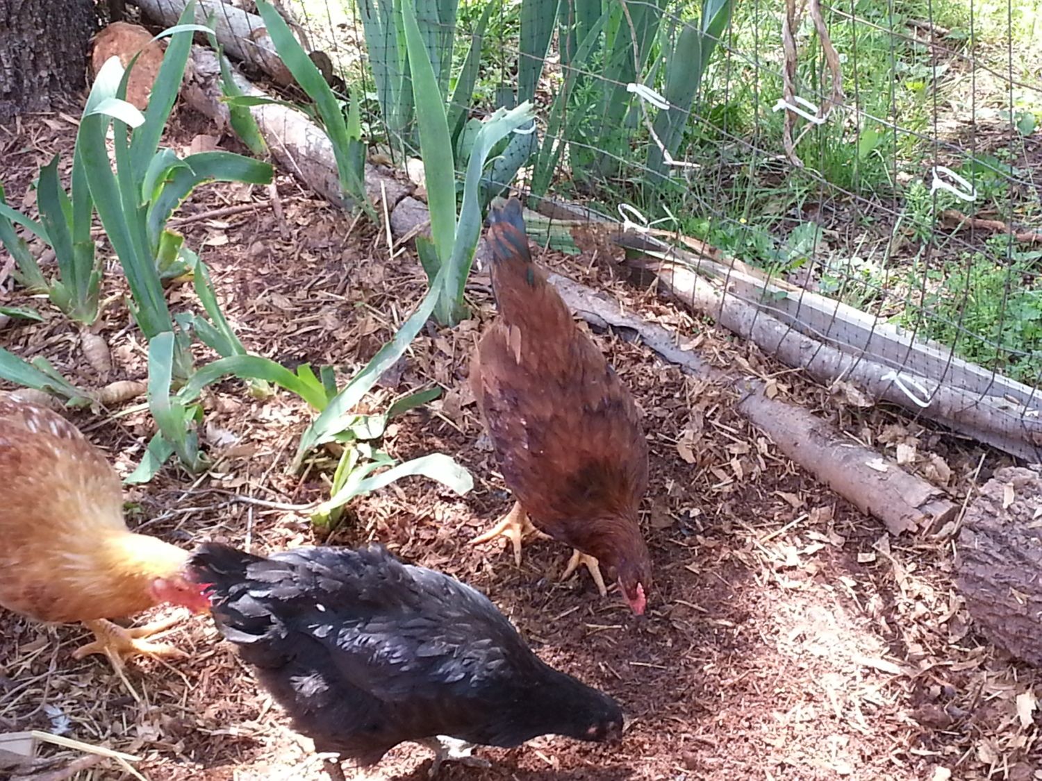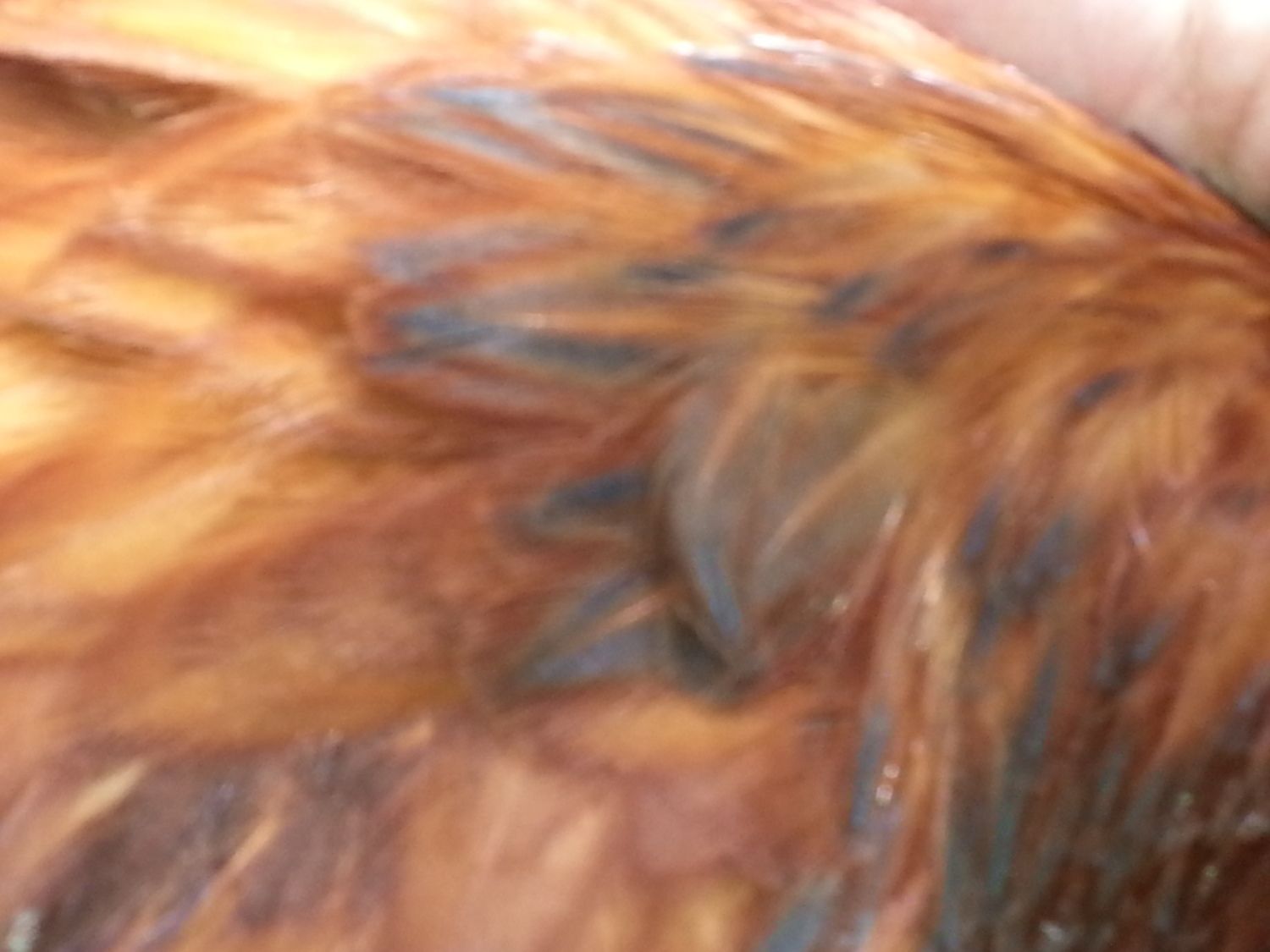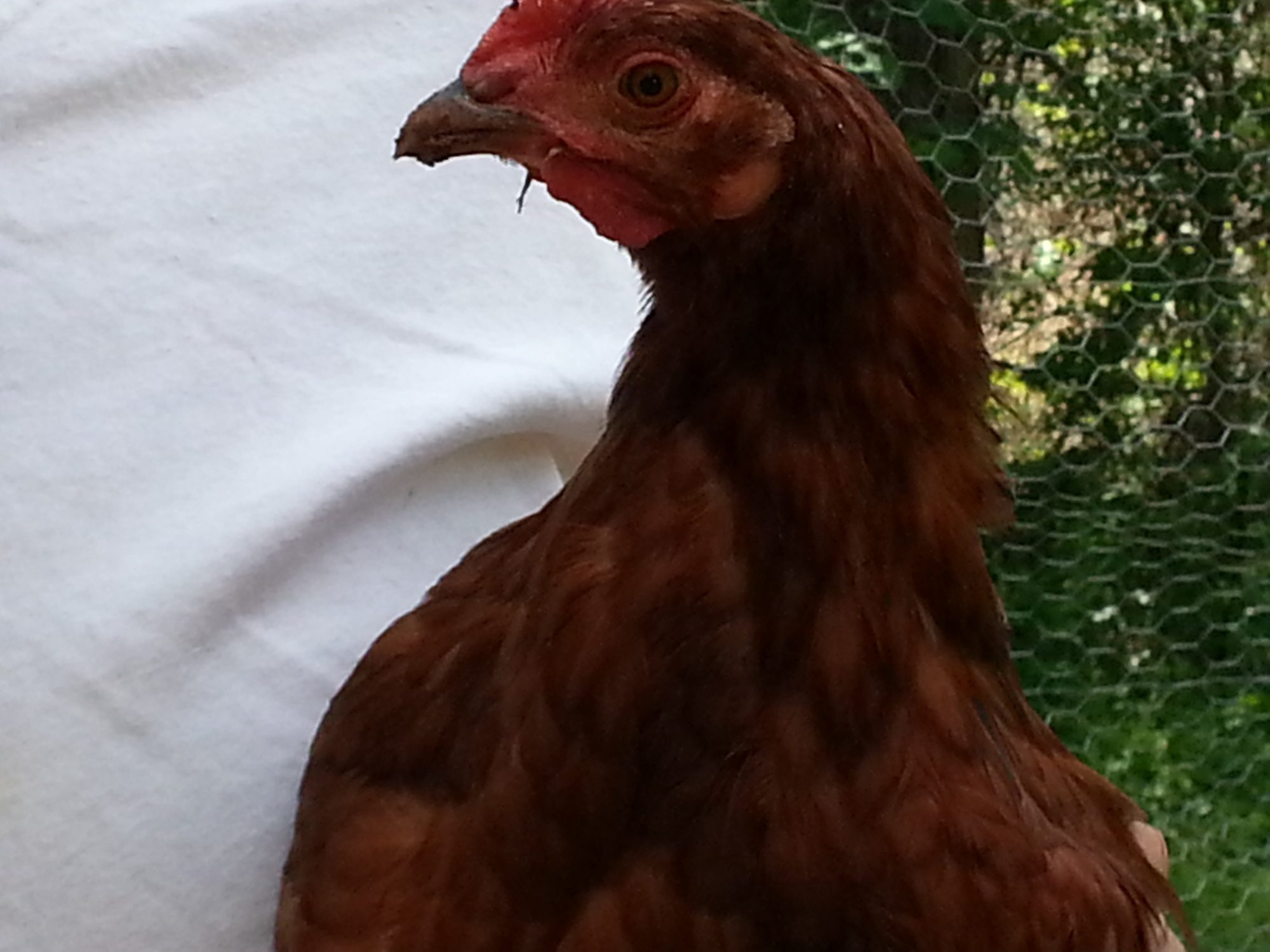I picked Echo out of the mystery bin because of his/her beautiful wings and pretty copper coloring. I originally thought that Echo was a red-sex link, but now I believe that he/she is a PR/RIR. Echo was the runt of the 17 chicks that I bought that day. He/she is still one of my smallest birds, somewhere between the Leghorns and the Australorps. Echo is the friendliest chick that we have, he/she will come up to me and my husband to be picked up, he/she loves to be carried around and snuggled. Echo also follows us around the pen like a puppy, always underfoot.