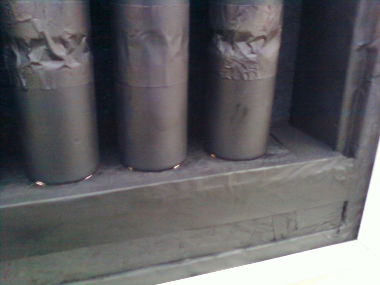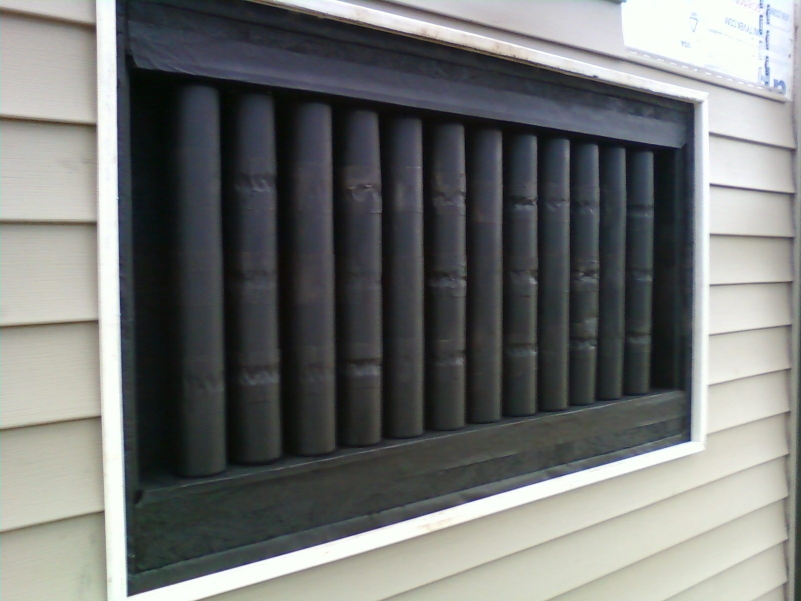 Here's how it works. A small frame is built on the top and bottom of the window with no backing toward the inside of the coop. Using a can opener, one can cut the tops and bottoms of a bunch of soda cans off, leaving aluminum tubes. These soda cans are then taped together with aluminum tape and laid out so that there is about a quarter of an inch of space in between them. With this spacing, holes that are big enough to allow the tops and bottoms of the cans only are then drilled through two boards which will be placed on top/bottom of the small frames. With these in place, the cans are fitted in so that they stretch between each hole and after all are in place, a board is fitted behind them (on the inside of the coop). This seals the cans off from the inside, leaving them exposed to the outside. These cans and the surrounding wood are then spray painted entirely black.