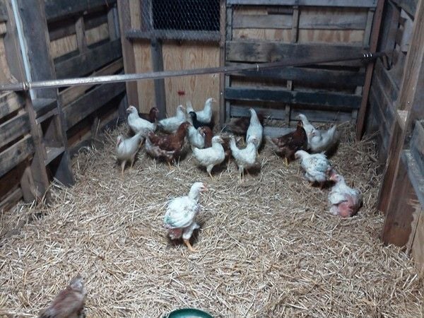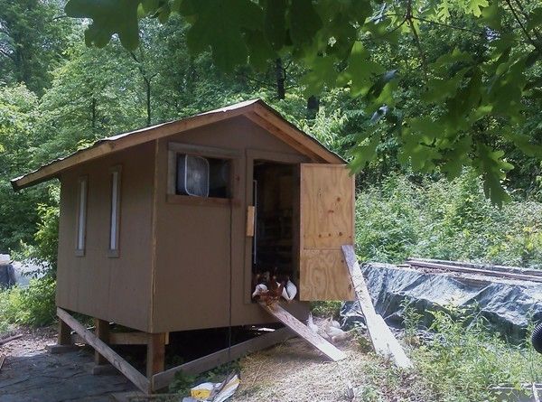 At this point I installed the skinny windows which were made by cutting sections from an old plastic shipping tote (275 gallon tank). - built a door - screened the end windows - and moved the birds in. They were very happy to be out of the brooder area I had set up in the shed. I found and old curtain rod for them to roost on and they took to it quickly, except for the Faverolles.