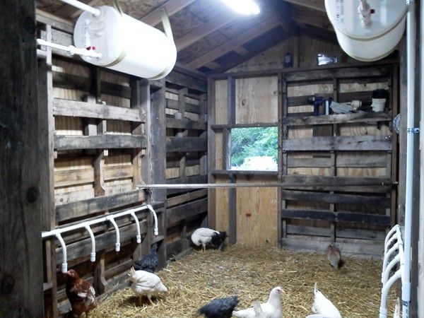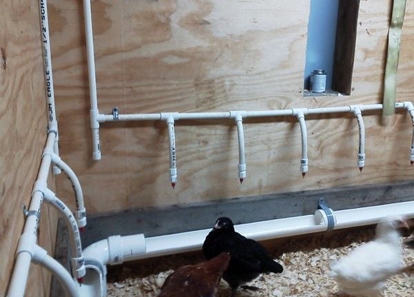 The water lines run down the wall to manifolds equipped with watering nipples. The chickens were pecking at them before I could even fill the tanks. NO MORE POOPY WATER !