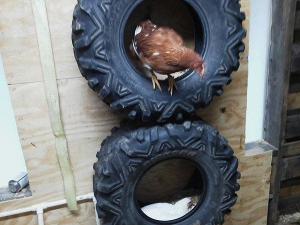 I found some large worn out ATV tires for free at the tire store and mounted them to the wall for use as nest boxes and I am on the hunt for some more.