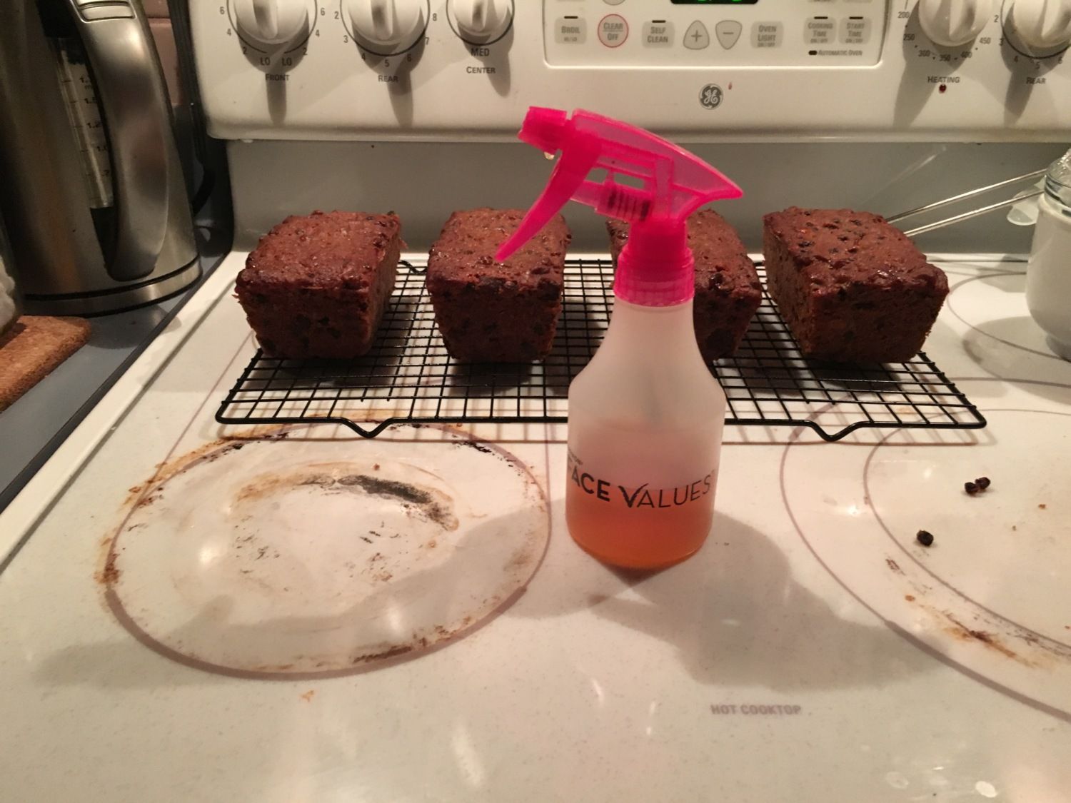 In case anyone wondered how fruitcake could possibly be held that long to age, please note the level of brandy above and in the photo below. And they haven't even finished cooling yet. They'll be wrapped in brandy soaked cheesecloth and kept in an airtight container, and resoaked in brandy every week or so, for... well, potentially, indefinitely.![]()