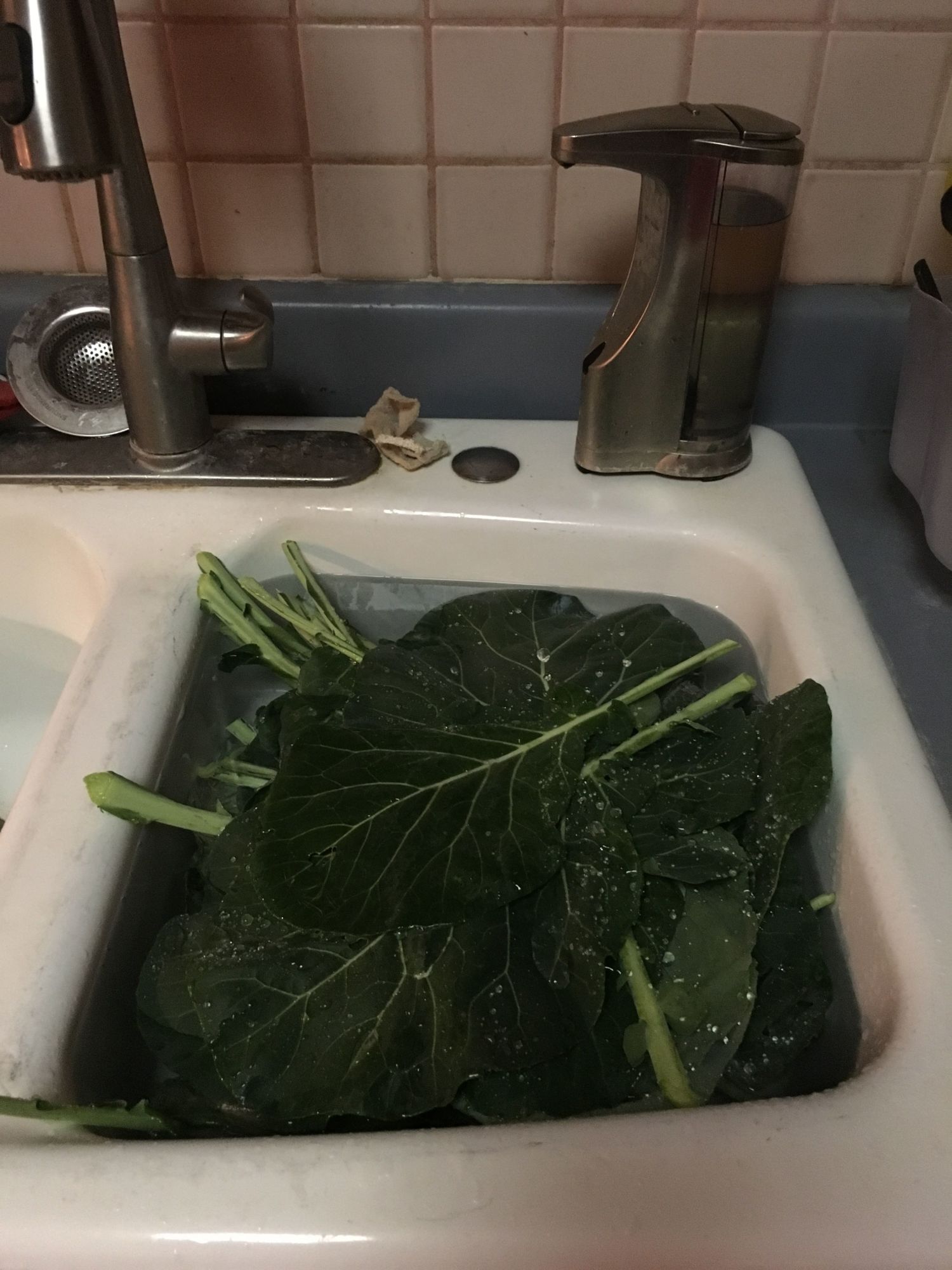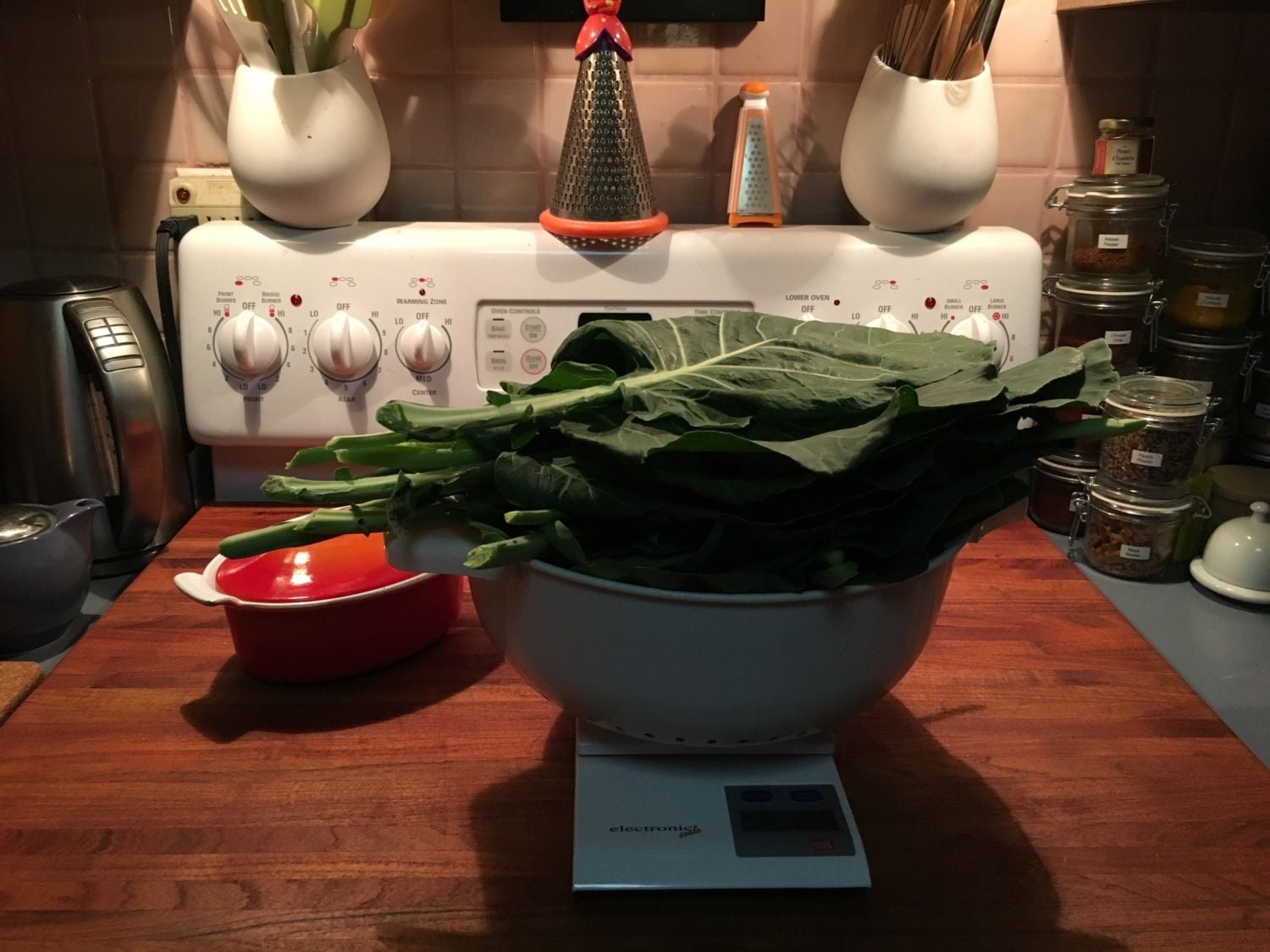 In case anyone ever wondered, this is what 1-3/4 pounds of collard greens looks like. (My mother used to wash them in the bath tub). I'm about to make Kashmiri-style collard greens (Madhur Jaffrey's recipe). Yum!!!