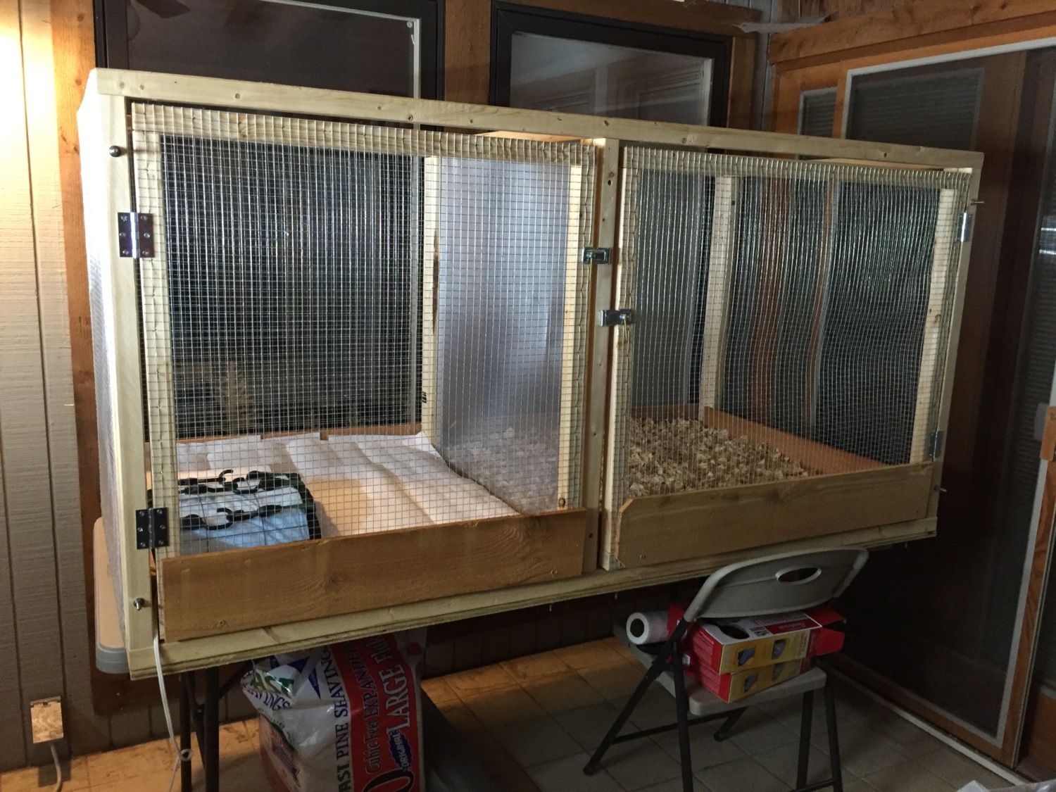 Thanks! I made it as a mini version of my big brooder that I designed for large batches of chicks - that one is 6x3 and 3ft tall. Worked great - and I can put a divider in the middle when I have two groups of chicks that I want to eventually merge. After last year's brooding was over, it turned into my chicken infirmary, and I decided that I wasn't sure I could clean it sufficiently to put babies back in (and also I like having it available for injured birds at a moment's notice). So I'm building two more, and they'll go over in the little "main house" (the one with the leaky roof that I treat as storage and garage).