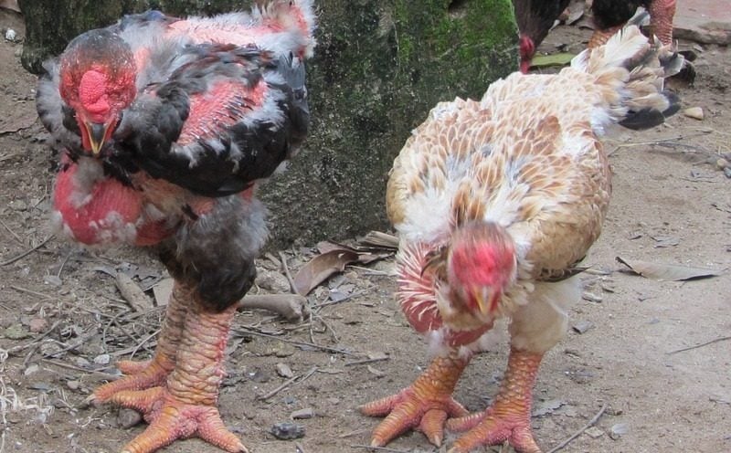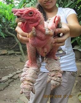 Different gene - Sc, or scaleless. The chickens are totally naked, and also have no scales on their feet. I know someone here on BYC who has them - they're a bit of a struggle in the winter, she sews clothes for them.