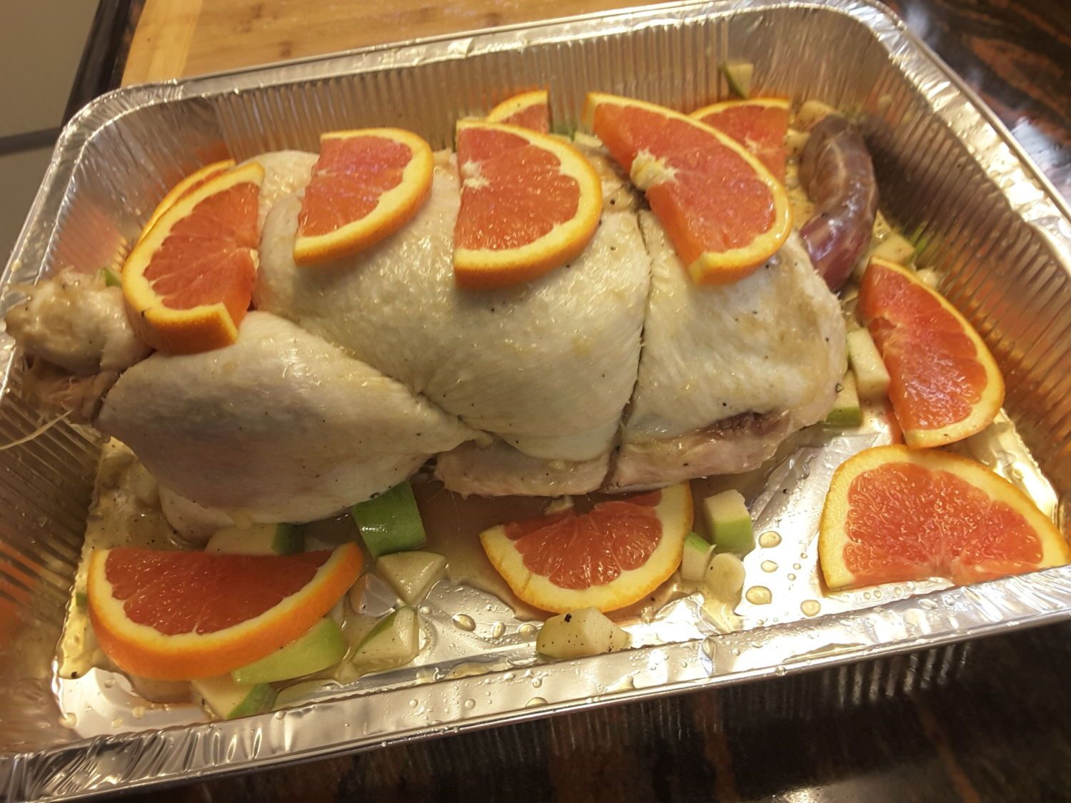 A grilled duck stuffed with granny smith apple and cinnamon, marinated in honey garlic,lemon and garnished with blood oranges!