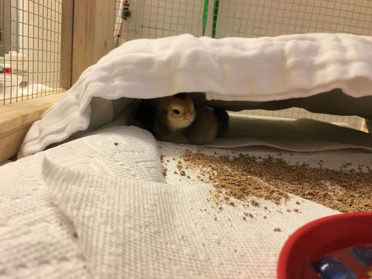 awww I love chipmunks!!!I came home early to a bunch of chicks! Four of the five OE babies had hatched, and were all dry (so hatched in the morning), and were miserable in their net bag, so even though there were a couple more pips, I quickly freed them and moved to the brooder while putting a wet sponge in the hatcher - fortunately, this hatcher comes back to temp and humidity very fast. Also, "Switch's" egg hatched, and it's fully feathers, so NOT Switch's baby. Probably Polly, the hatchery NH. :/ And one of Puppy's babies was also wandering around, unfettered - looks exactly like daddy. Since I've been home, the final OE egg hatched (in the bag), I rescued the "Switch" chick in a solo bag (miserable little thing), and moved it and Puppy's baby into the brooder. All babies have colored leg bands - I'll have to check/swap out in a couple days (no time to finesse a larger diameter, so they will grow out of them a bit sooner). The last OE chick is drying off right now, and three of the four remaining Puppy eggs has pipped. I hate opening the 'bator when eggs have pipped, but these chicks were struggling in the net bags - hoping they'll be ok. (they also got rolled all over creation). Here's the first chick to wander out to see me:![]()