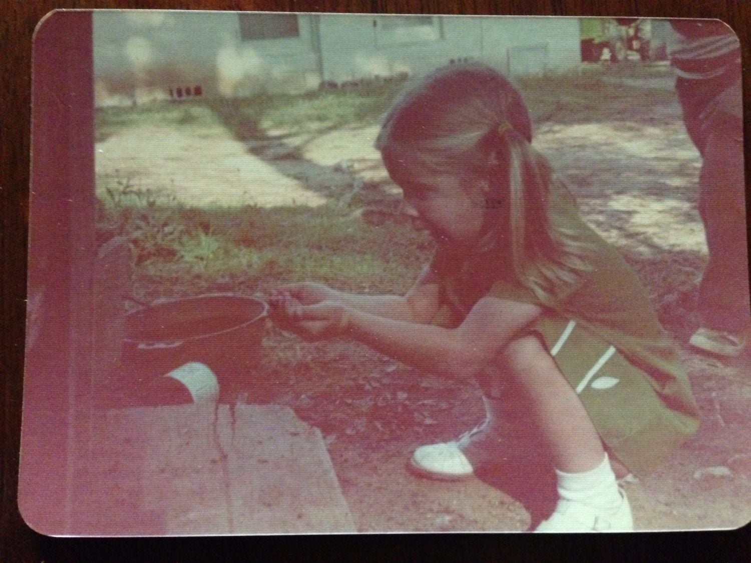 Awwwwwwe!No pics of the process. Pics of the chicks? Not yet - I'll get weights and pics tomorrow for the 3 week weigh in.But my mother sent me this - a photo of me at 4 years old feeding chickens - it's hard to see the chickens, but that's me alright. That was my favorite dress at that age. (I have no memory of this, but I was apparently destined to keep chickens.)