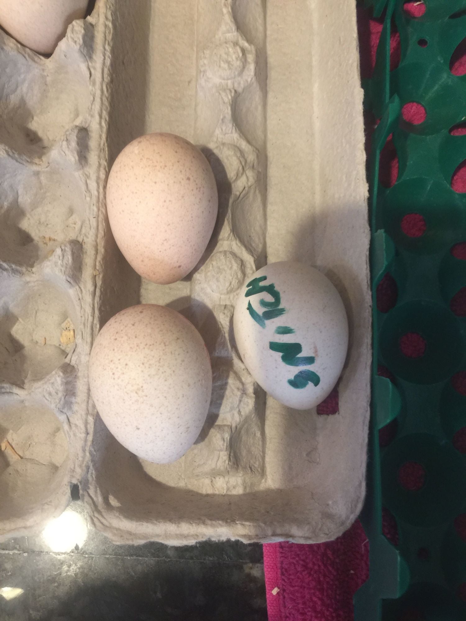 So I have no idea where this came from - it was in the turkey nesting boxes. It is speckled sort of - but more of a brown coloration with white speckles, it's just hard to see in that picture.