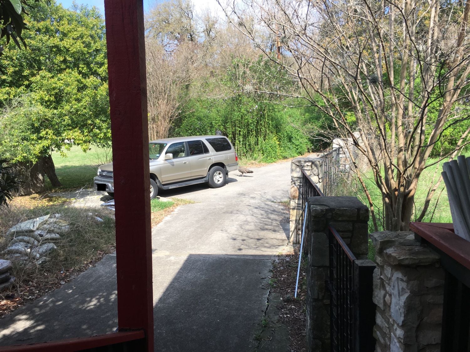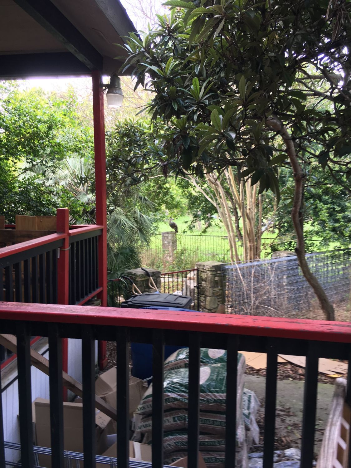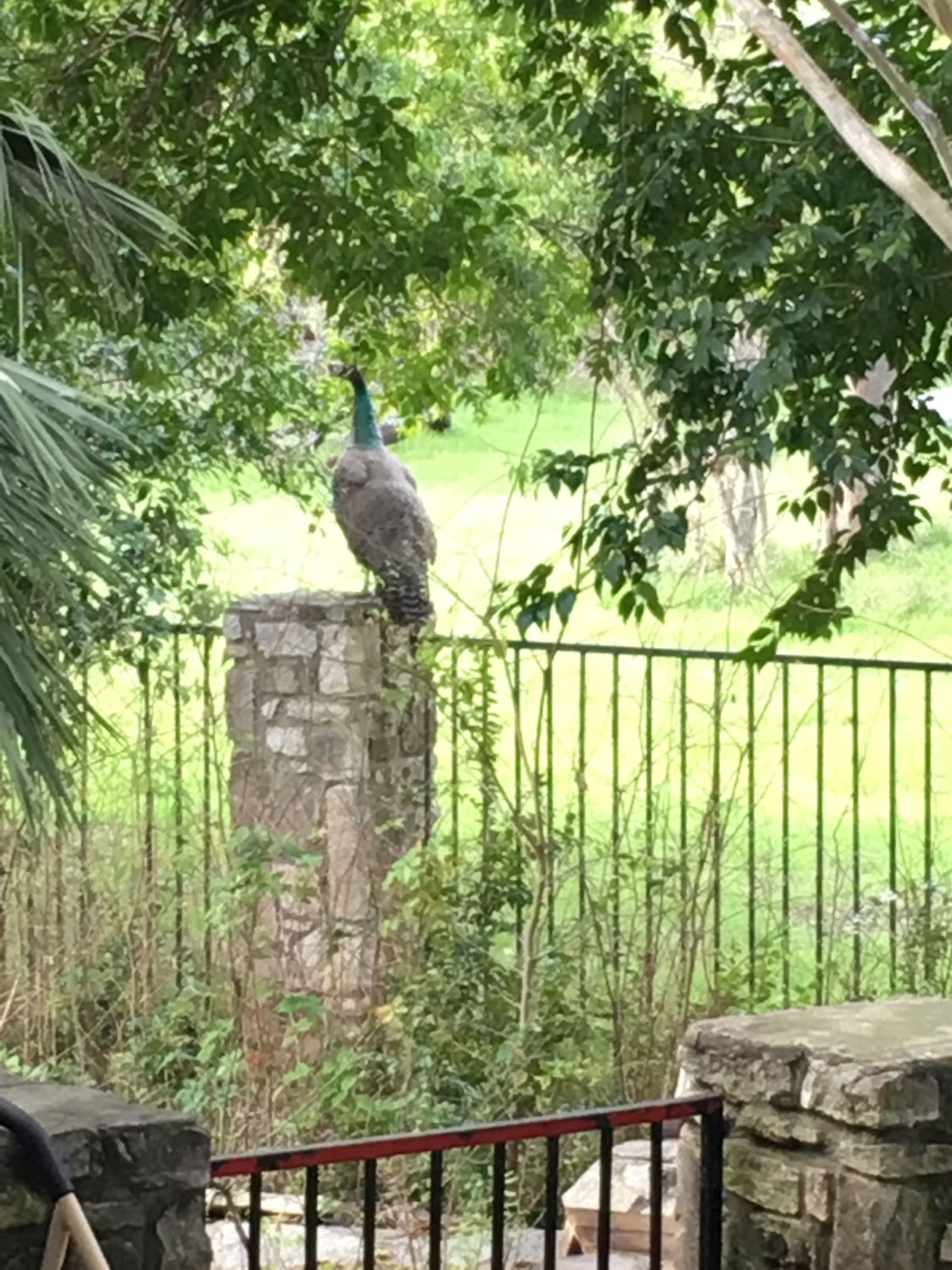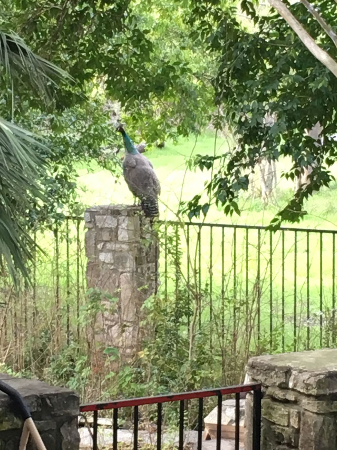 While I was on the porch wrangling hardware cloth, a peahen from our neighborhood's feral flock came down the driveway to visit me - I couldn't get my phone out fast enough, that's her walking behind the car. But later she hung out in top of one of my fence supports. They usually move through as a flock (I had all of them wander through my yard a couple years ago), weird for her to be cruising around on her own (and you could hear her friends complain about it several houses down). This flock of peafowl has been in the neighborhood since the 1930s, when they were owned by someone who lived here. Since then, they have lived here - they don't belong to anyone anymore, and just wander our neighborhood as their territory.
