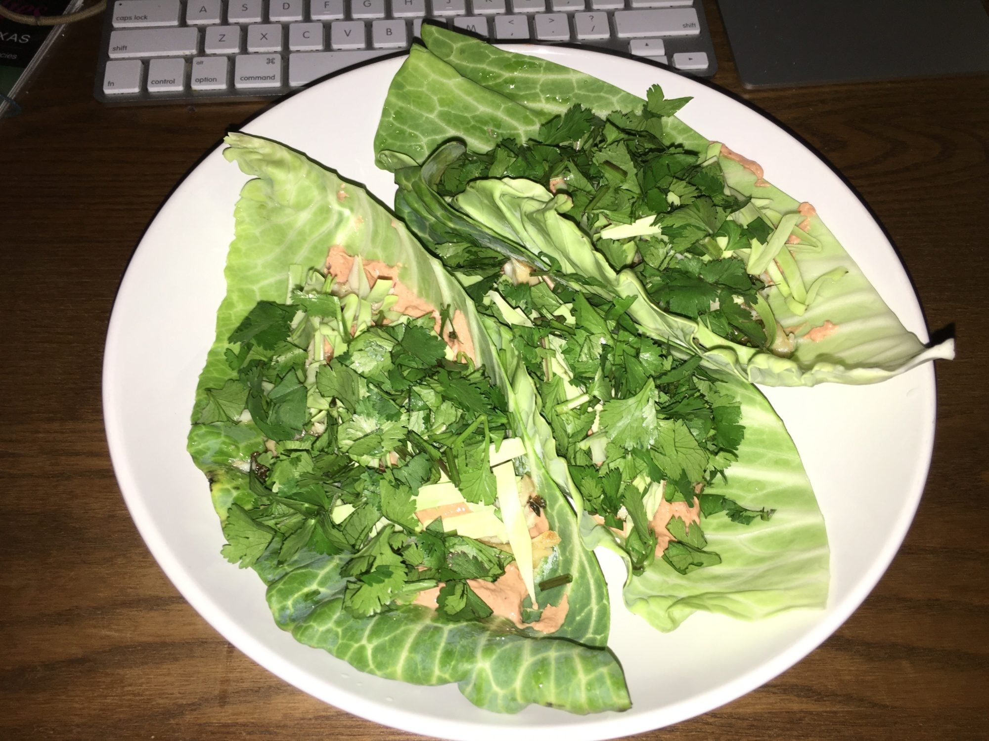 Fish tacos for dinner - yum! (I use cabbage leaves rather than tortillas.)