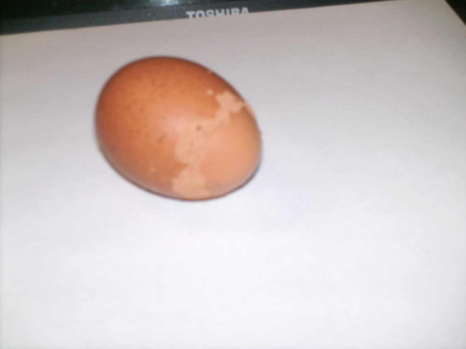 This is a 1st for me. The flash washed it out a bit, and I don't know how to correct that. but the near end of this freshly laid (as in some time after I collected yesterday evening) is perfectly smooth, as you'd expect it to be; the lower portion (which appears considerably darker, but really isn't) has a rougher texture. What appears in the photo as an irregular band goes completely around the shell. The only thing I can liken the band to is the cluster of eggs that some common local insect lays on tree leaves.