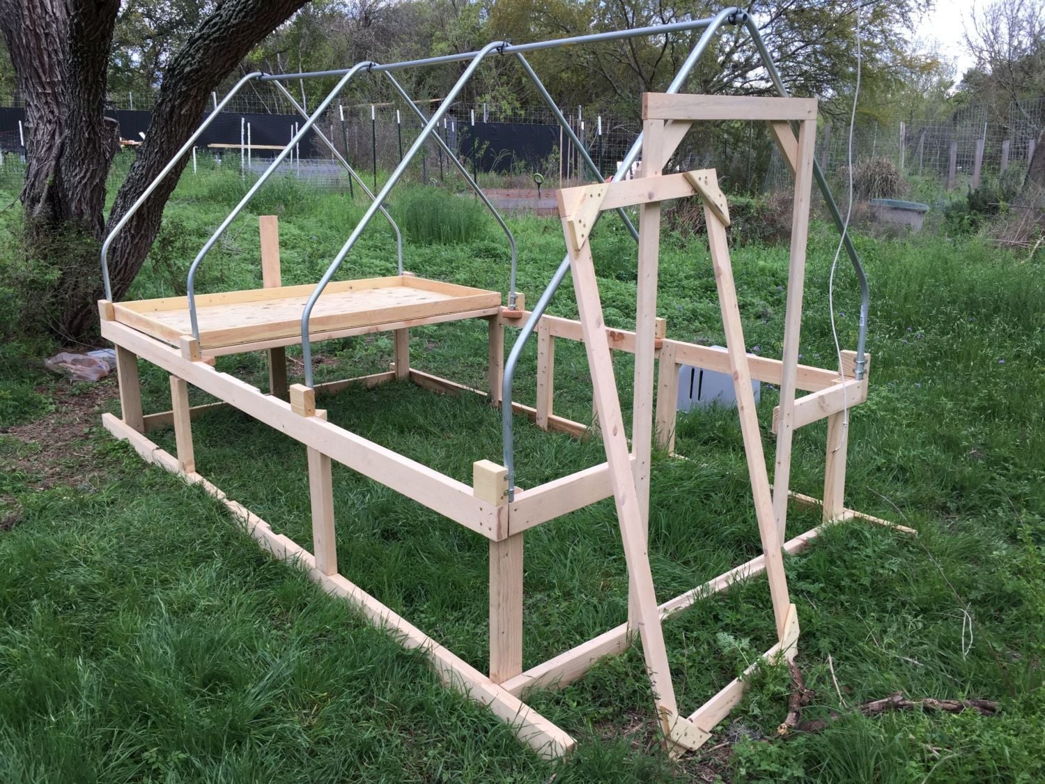 Coops are 5'7" x 10', approx. 60sf - and I get more space by having the roost platform (additional 6x3 = 18sf). I've found the limitation is related to how high your roosts are/how many can sit on those roosts under the sloping roof - by having the conduits bolted higher up, there's more space for more. I use a 10x12 tarp - doesn't come all the way down on both sides (I have an egg door on one side). Speaking of which, I need to get some more tarps...@Fire Ant Farm