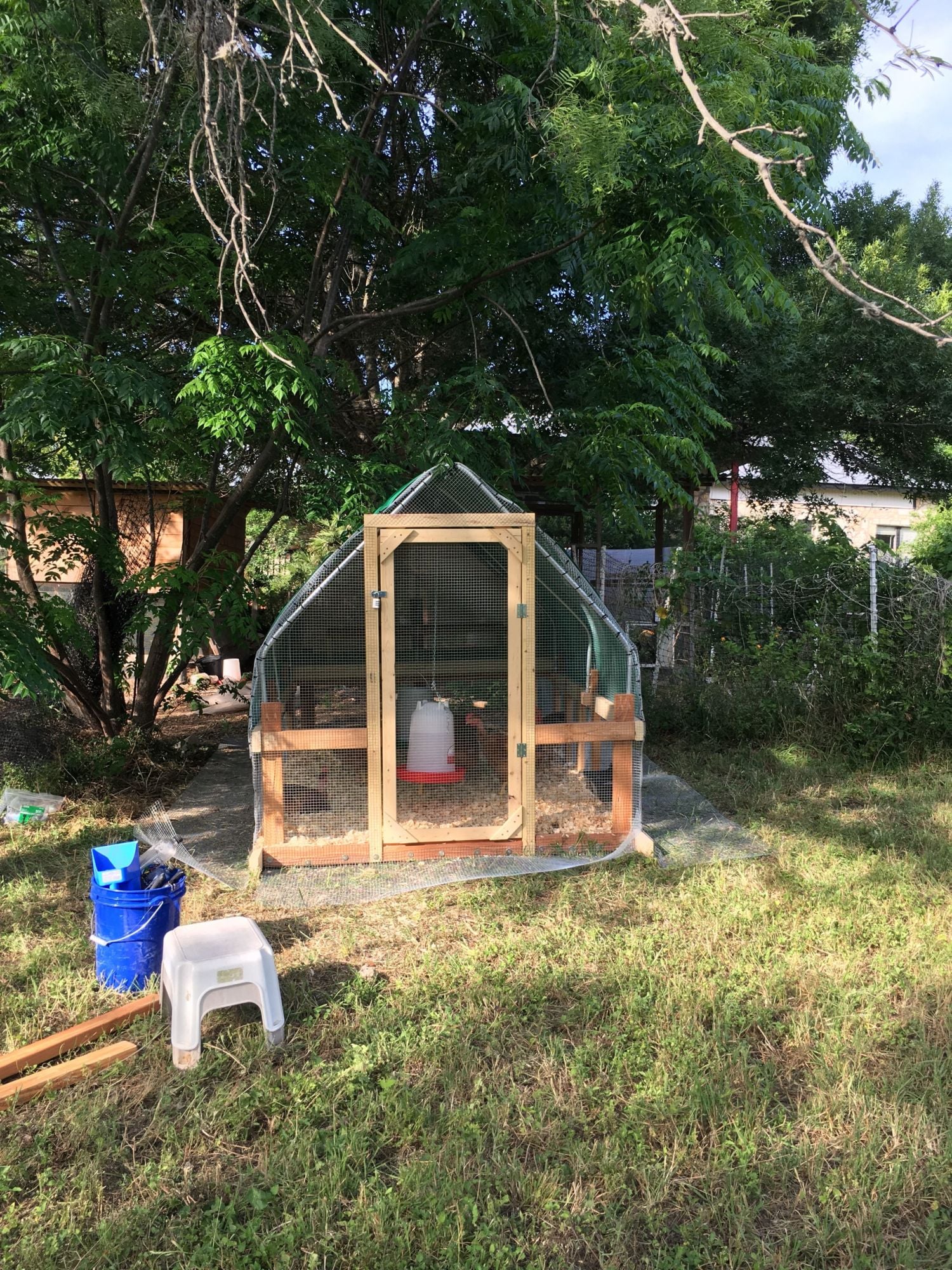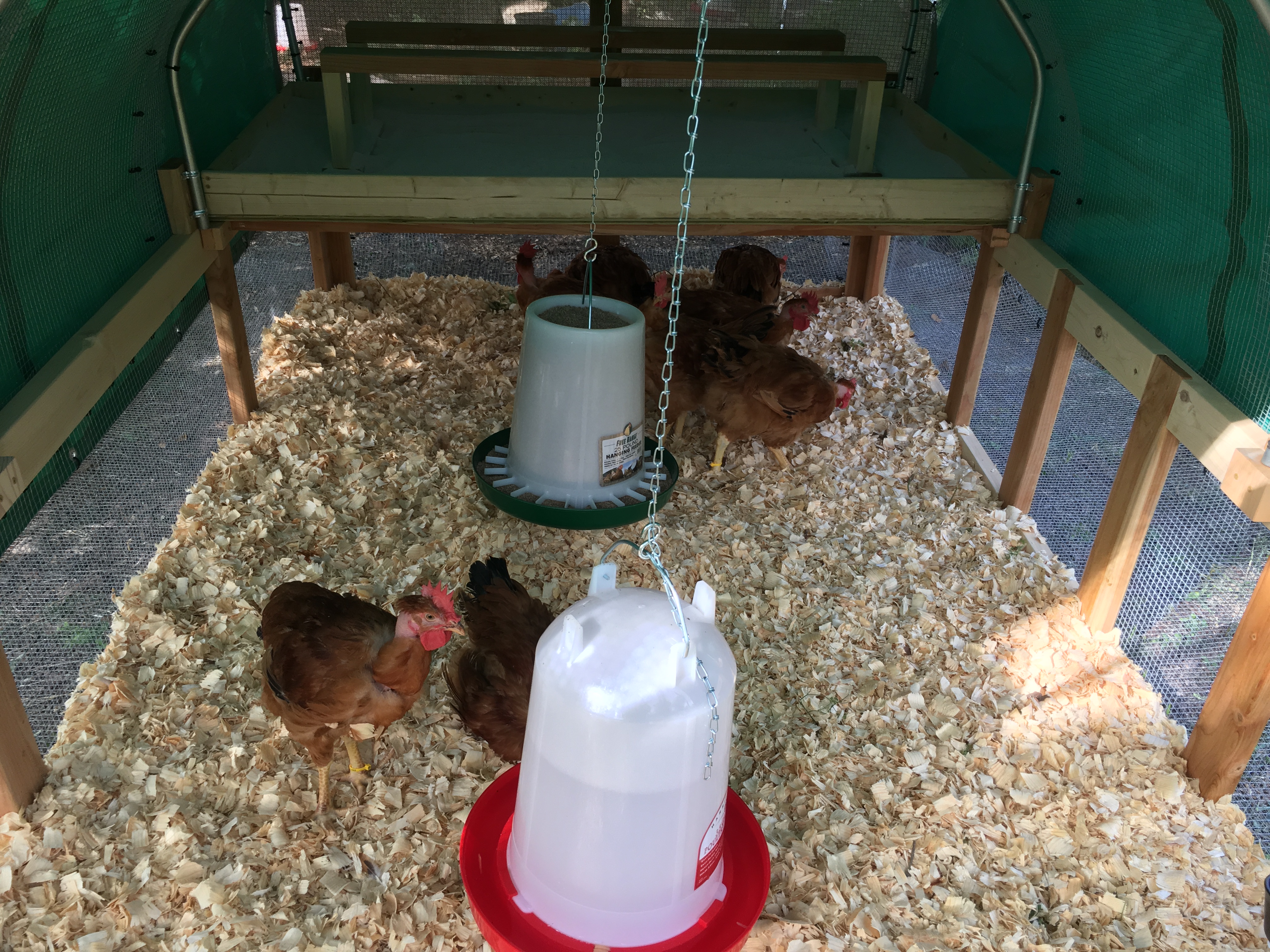 That 1st picture...is that tractor light enough to move around by hand with wheels, or is some sort of tow vehicle needed?Another full day of work. I really do need stock win zip ties. I only got one finished, but at least I was able to move the S&G boys (the messiest of the bunch) out this evening. Here are some photos (before I finished tacking the apron down). This is the cleanest this coop will ever look, of course. I moved them to the roost after dark. No idea how easy it will be for them to get up there - they may need a ramp. (Big boys!)
