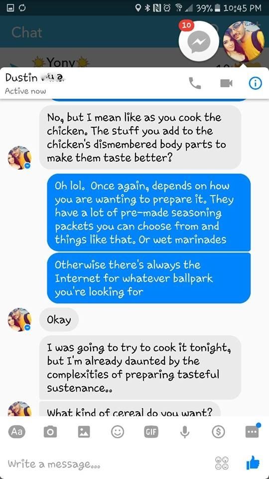 ) got a promotion at work and her hours changed. Now, she and her husband of 2 years have always worked screwy hours and mealtimes are sporadic - and late - but this night Dustin wanted to have a nice dinner waiting for her when she got home. The results are hilarious! She posted the text messages that went back and forth between them on Facebook today and I can't stop laughing. Don't forget to read the last line!