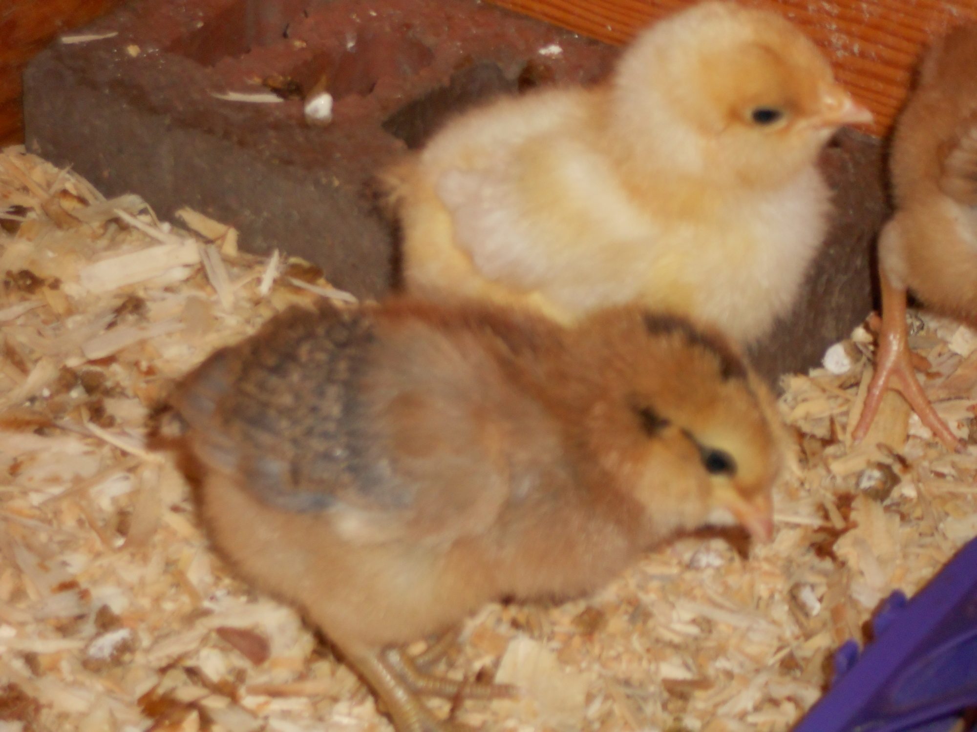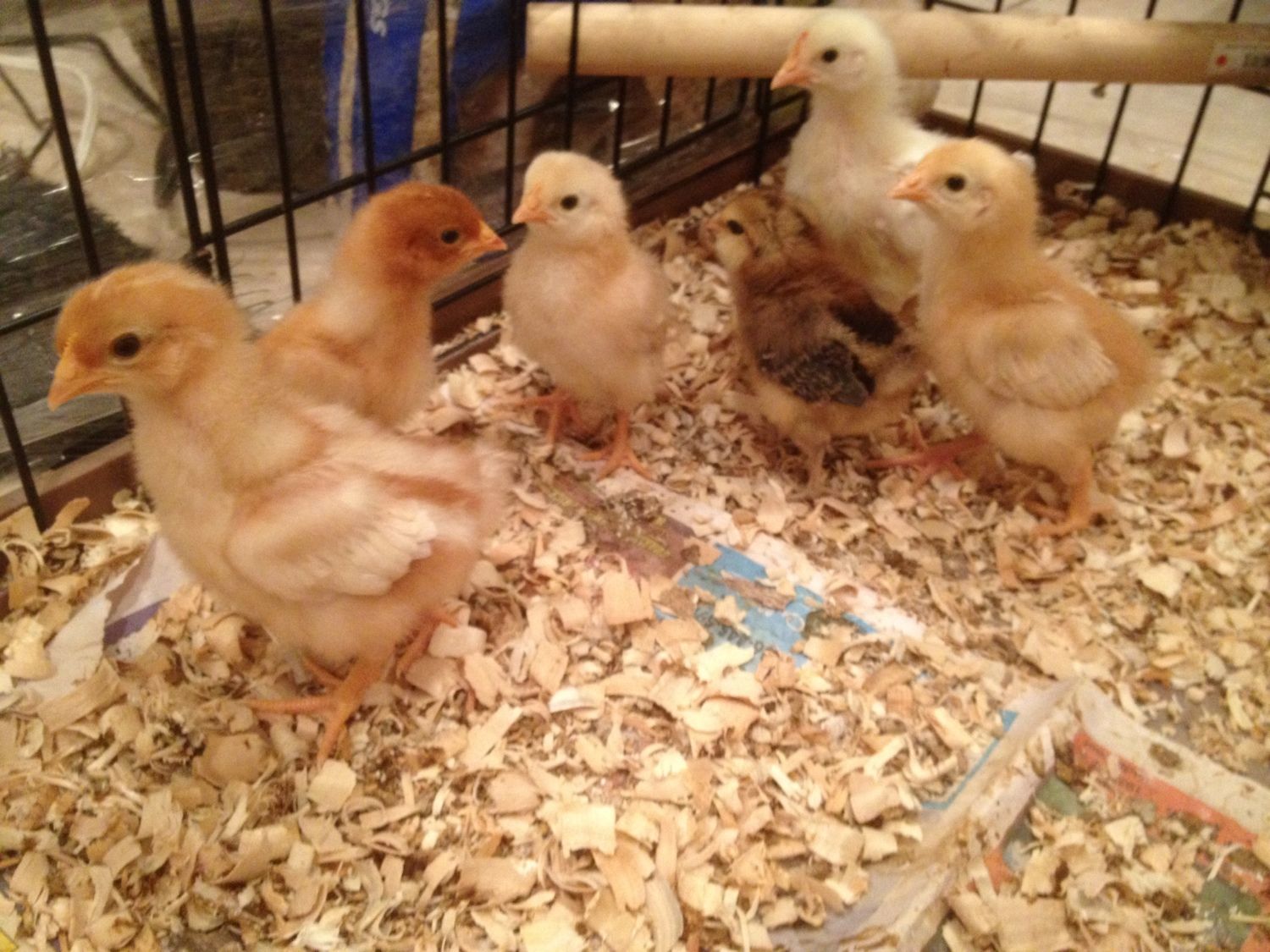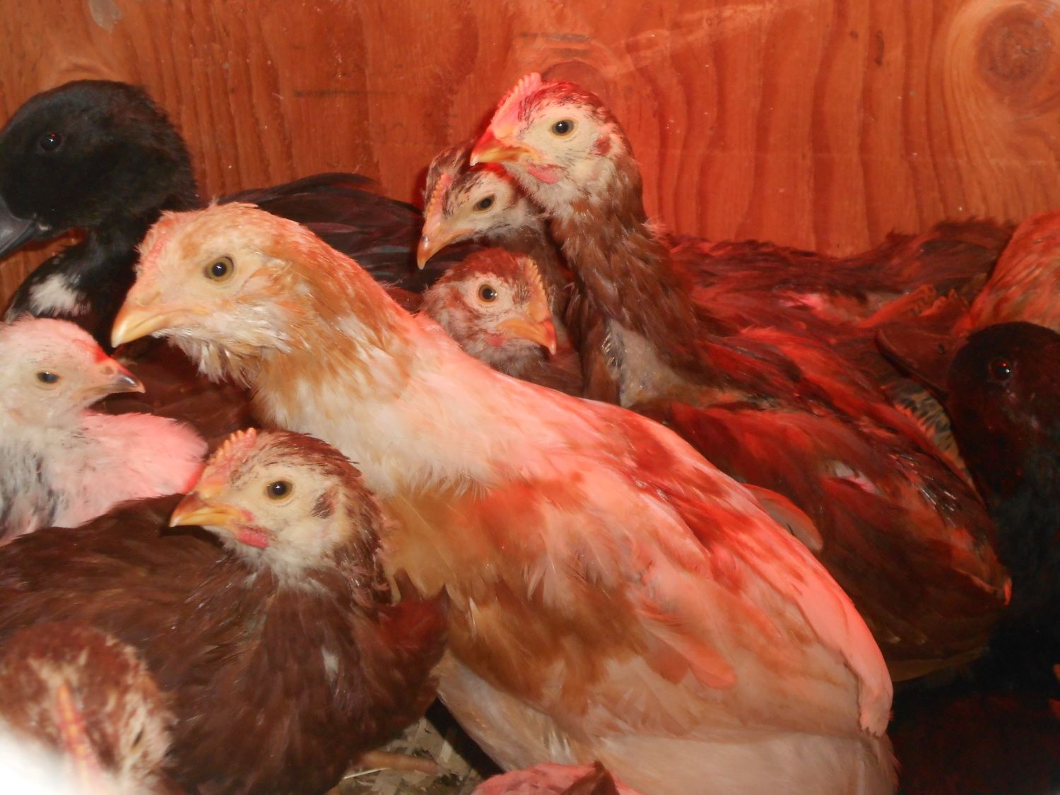 The two on the left are red pullets, two whitesh looking ones, and another red- but you can see the little Easter Egger in the middle!