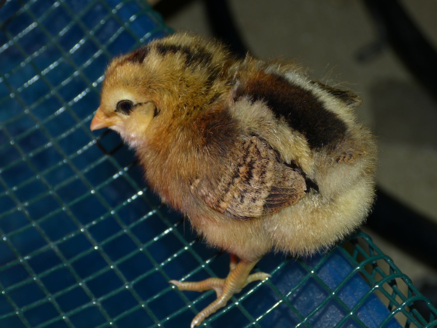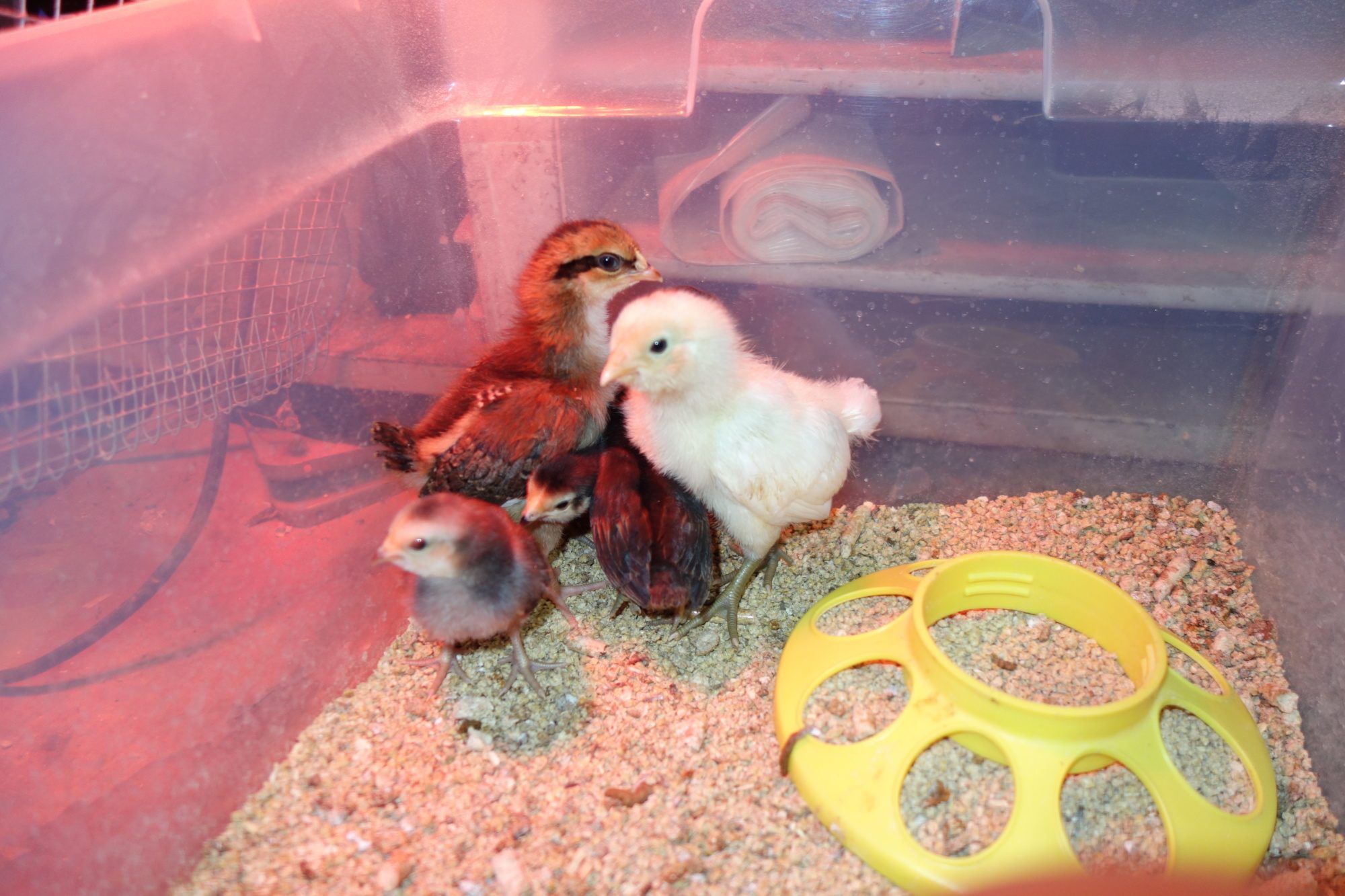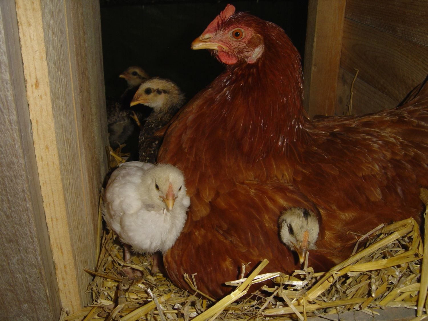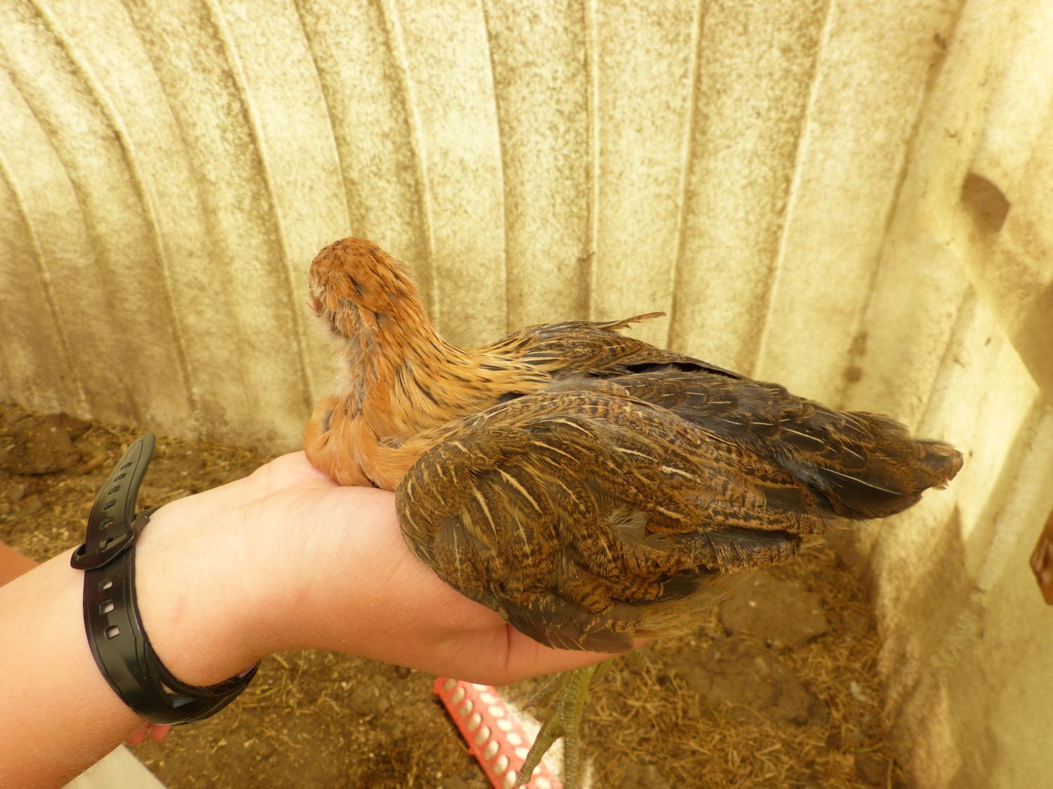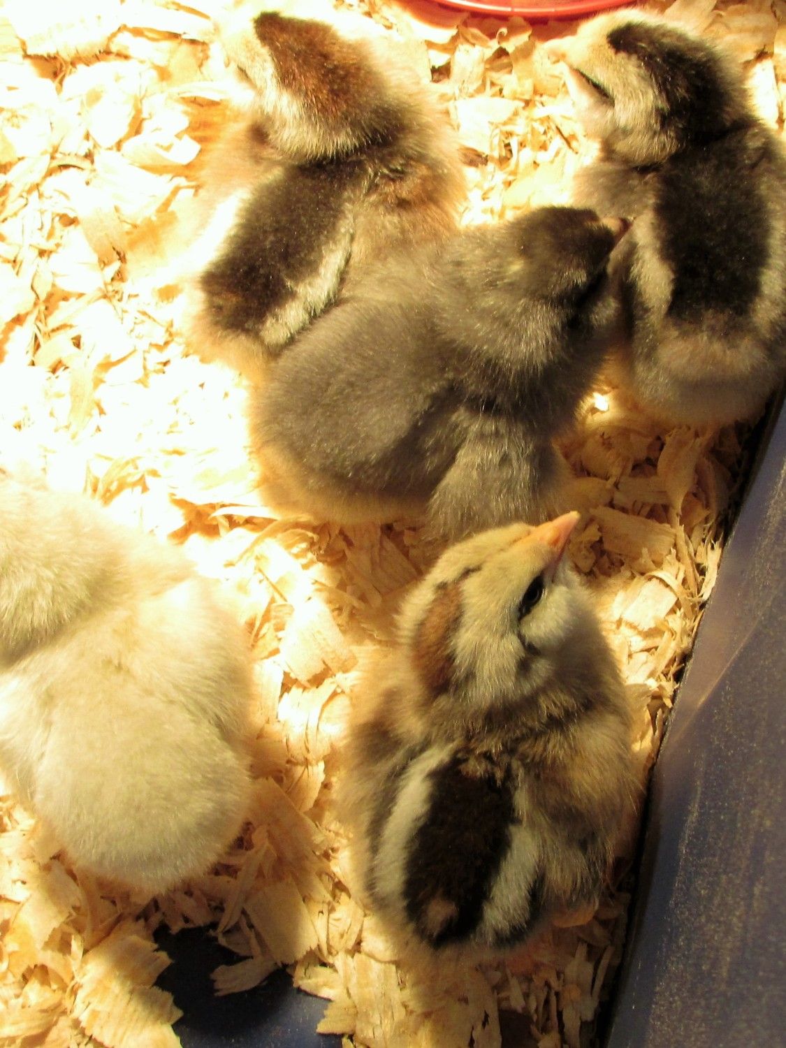 photo 1 us the full hatch, we originally set out with 5 eggs but somehow ended with 7, 5 hatched day 1 and one a day later, the last hatched on day 4 but the other 6 were already feeding and running in the coop and the late one died in the nest from an injury i think from being walked on as foster mum was in and out the nest teaching the others. the back 3 and the black are siblings and our purest araucanas, the one with markings in the front is from a suspected araucana cross