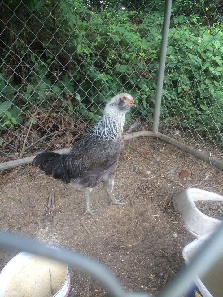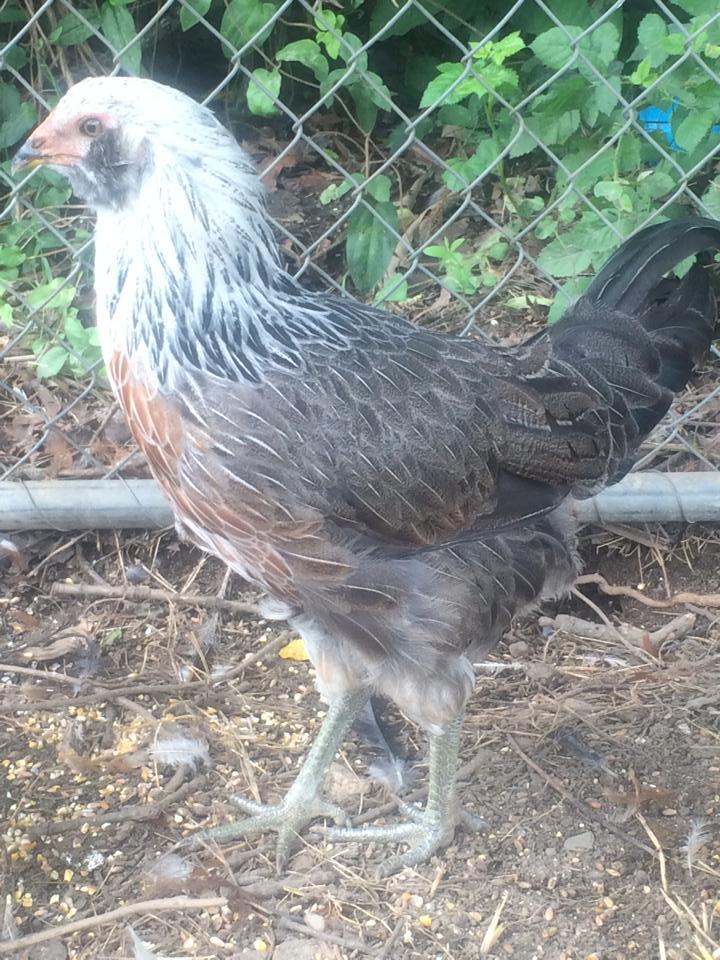 .Pullet, that is a typical female EE coloring with the silver feathering and salmon colored breast, and her comb is small and pale.