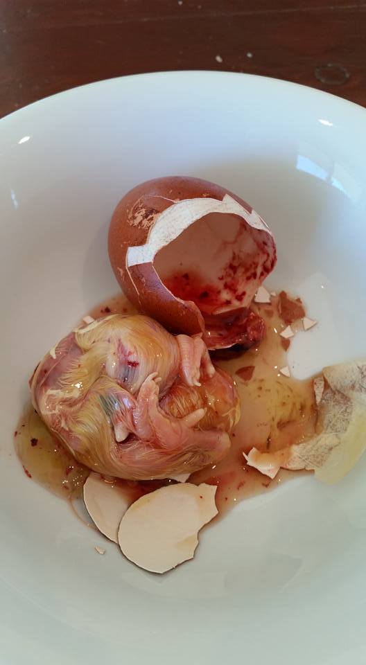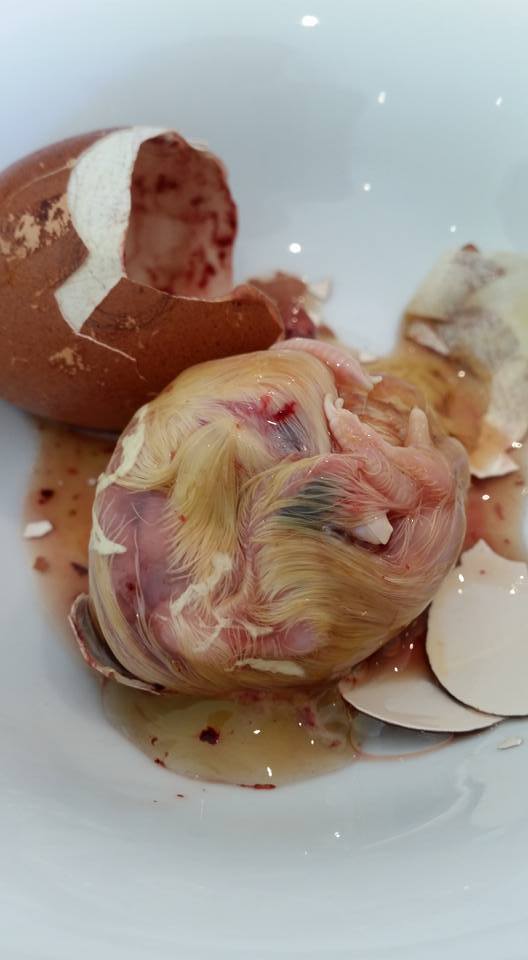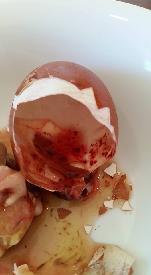 Chick has absorbed yolk and is in postion. Fully developed, healthy looking. However, there appers to be quite bit of excess fluid from the egg. This would leave me to believe that because of shell quality, that particular egg did not loose sufficent moisture and that is what caused the death. Chicks get into position (head under wing- beak up) around day 17 and yolk absorption generally takes place day 19-20, so that would make me think that death occured late day 20-21 ish.