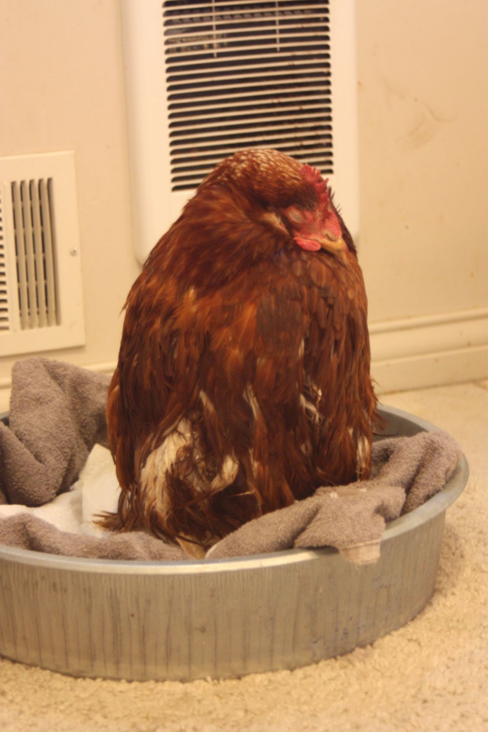 Soaked her in a warm bath for 30 minutes or so, she is now sitting in a toweled tray in the bathroom. Ran the shower a bit to get it warm and steamy.