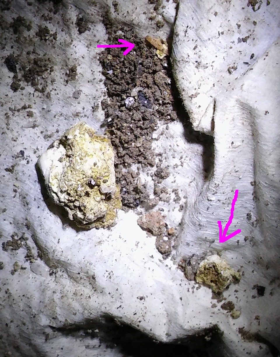 This picture is of the "yolk", after I chipped off two pieces (arrows) and moved it to a bin. The black stuff is ashes. The lighter left side of the big piece was on top before I chipped the pieces off.