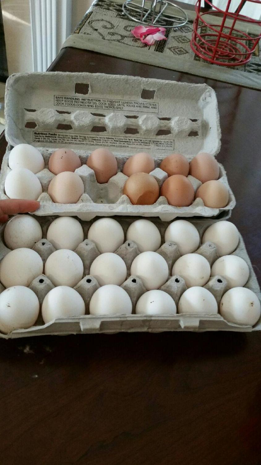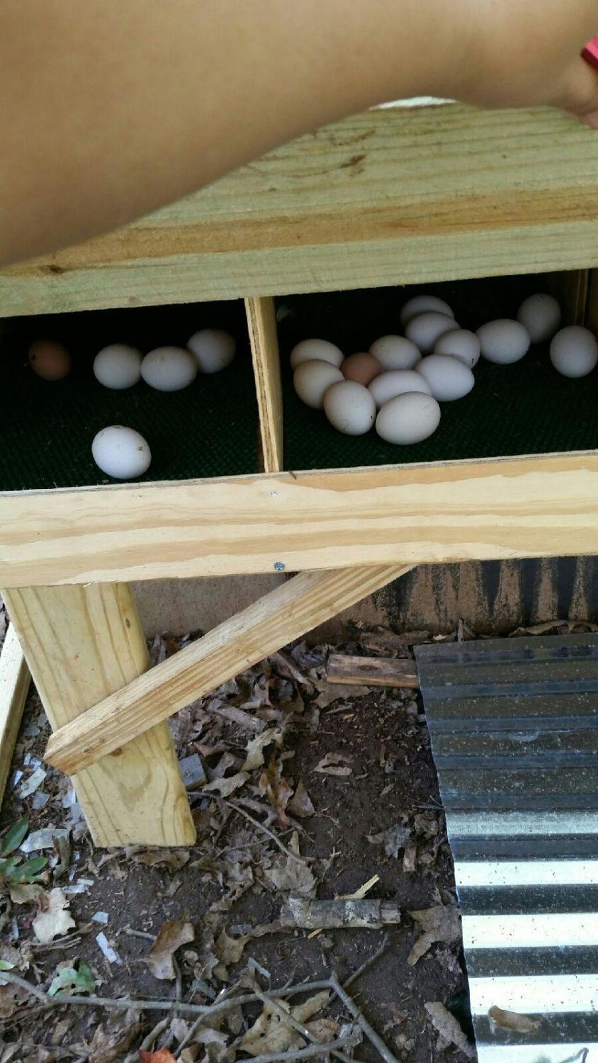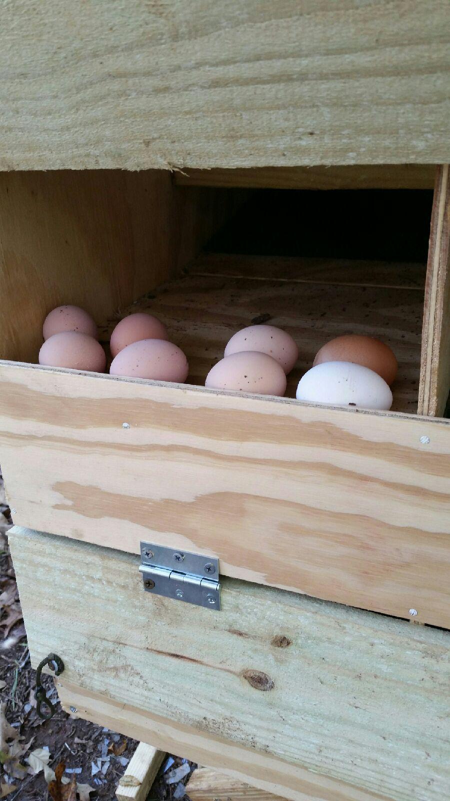 You can't see it here but there was a Leghorn laying the third egg in that same box.