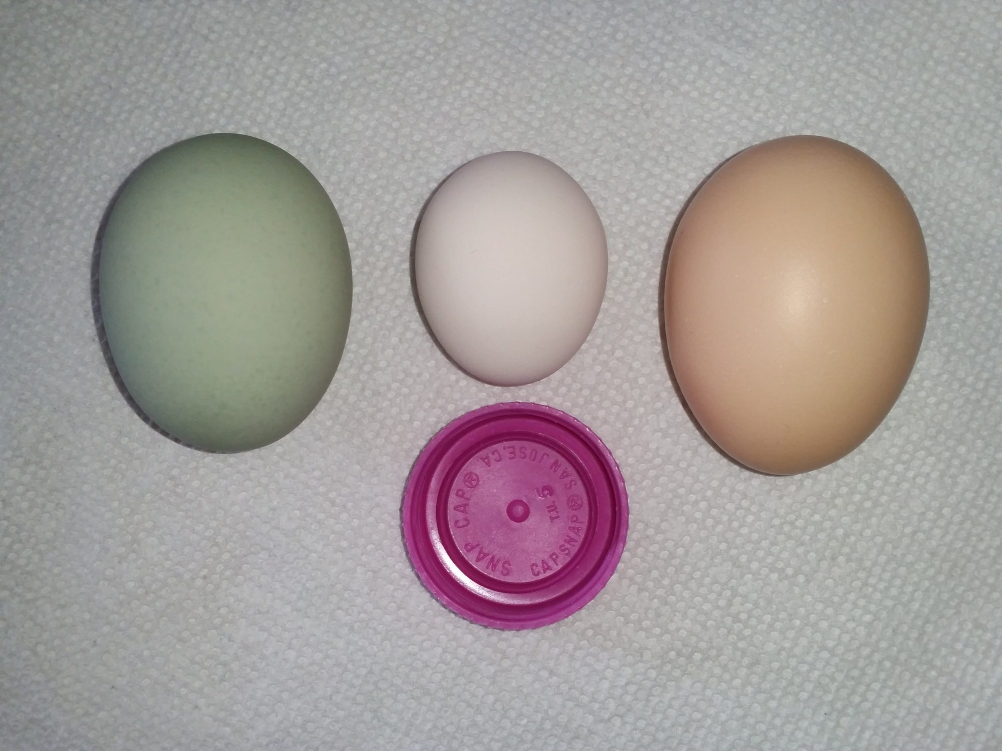 The white ones are duck eggs, the rest are Easter Eggers, Barred Rocks and Australorps.