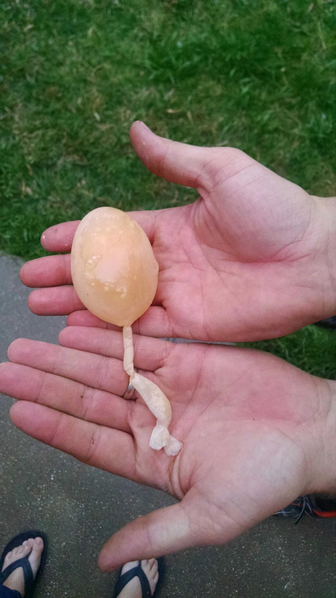 I found an egg with no shell in the coop yesterday. That is not totally unheard of. What surprised me, was that this egg had a tail!!!
