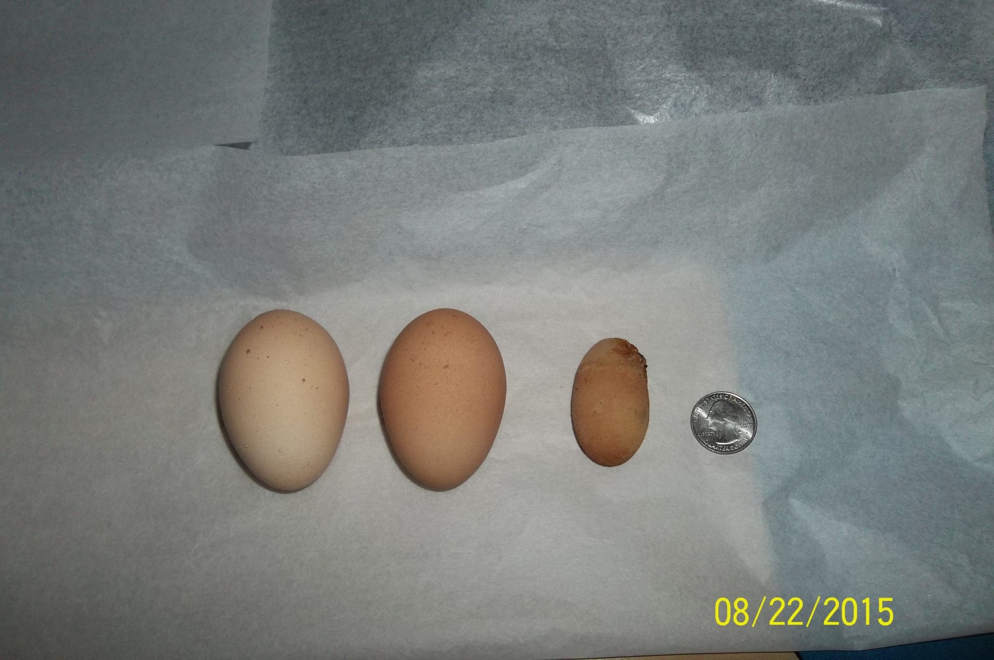 These are the eggs I gathered today. Usually I get 2 (I have 4 hens). Yesterday, I got one that was lighter than the others, weaker, and grainy. I'm thinking since they were sick, Only 2 were laying, and now the other 2 are just coming back. The one weak egg has always been...(from which hen I don't know.) NOW, this tiny egg with paper shell. I opened it and it smelled very much ammonia. Here are the pix.