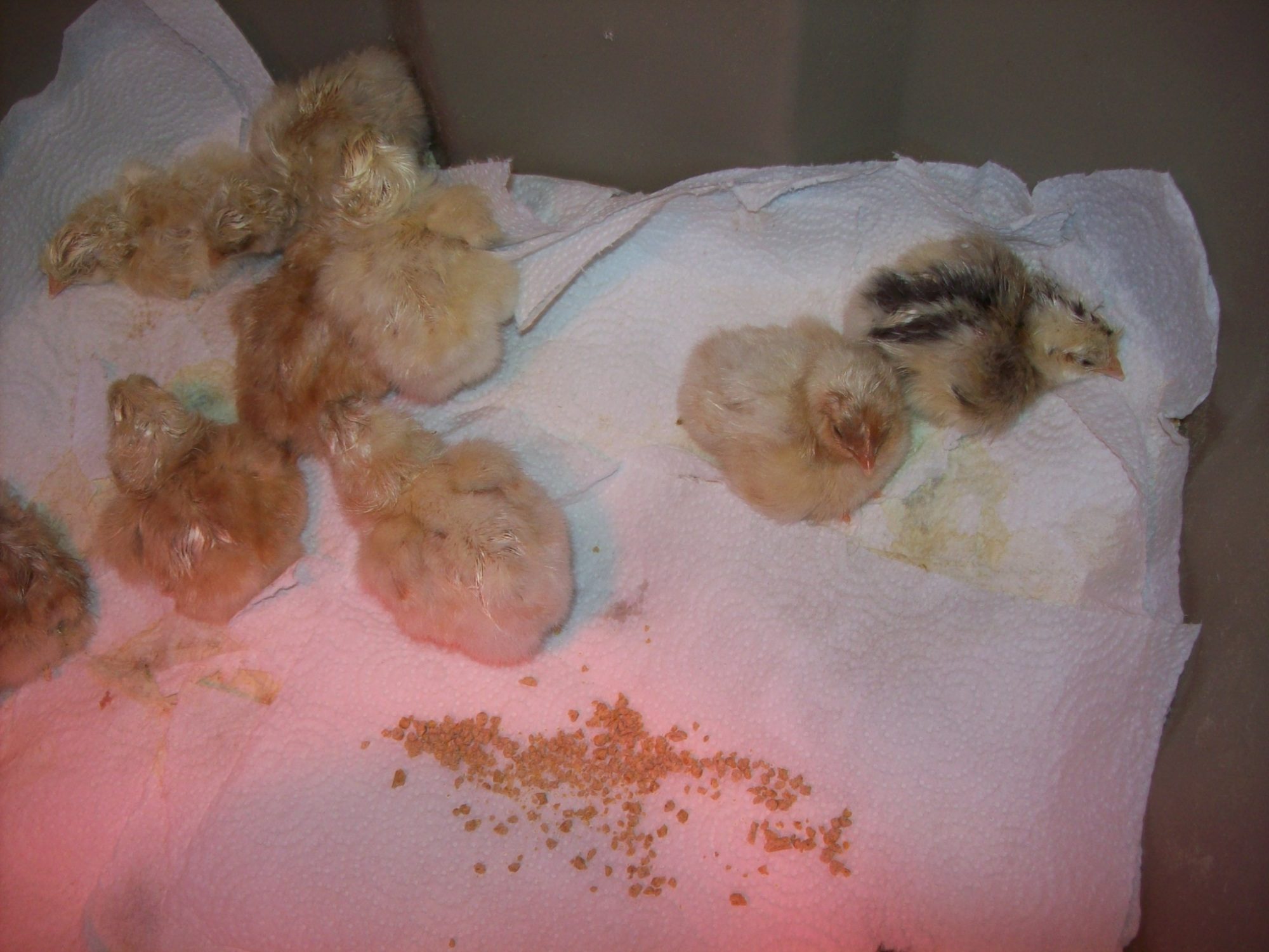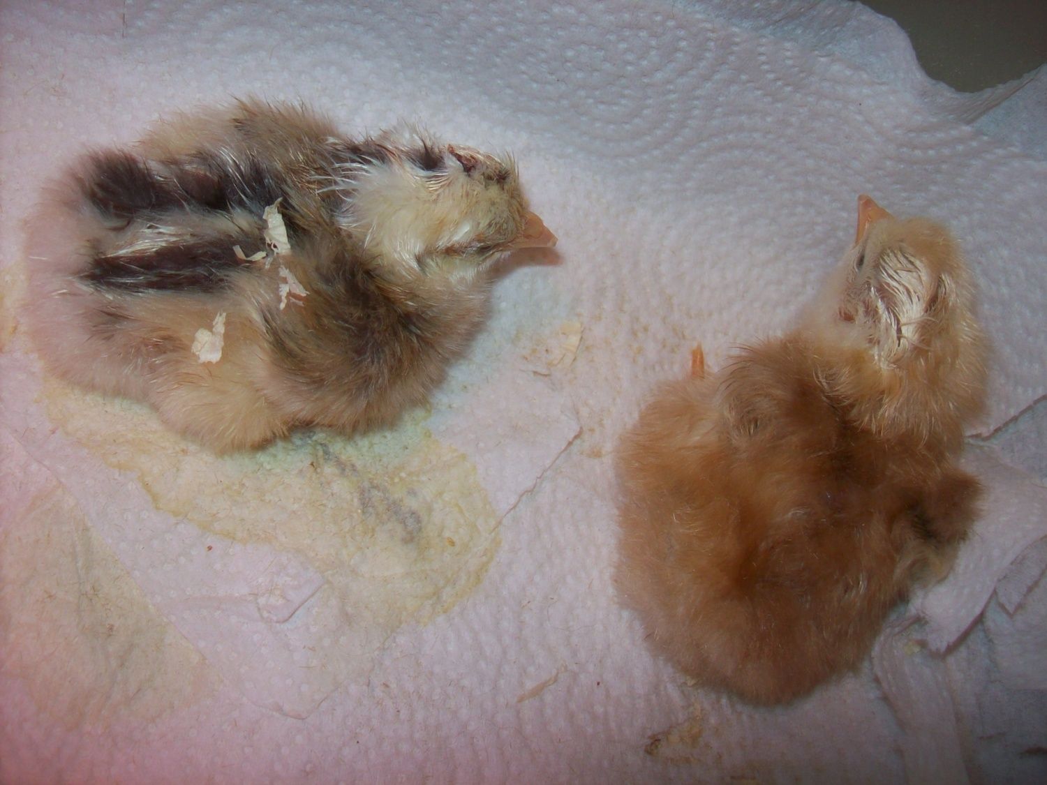 Congrats!!! I don't use the papertowel, I put them straight into the pine bedding. I think most that do only use it for 2-3 days, but I could be wrong.well i have 11 of 16 hatched, the guy we call pancake is still sleepy but i give sugar water and little salt, clear water and i have seen him peck at food some, if the trouble makers get them all going he gets up and walks and moves then lays down like a flat pancake again, also how long before i take up the paper towel and let them on pine, the trouble chicks keep ripping the paper up and playing in the pine????thanks, 5 eggs still in bator, dont think it will happen but im still in the time zone,