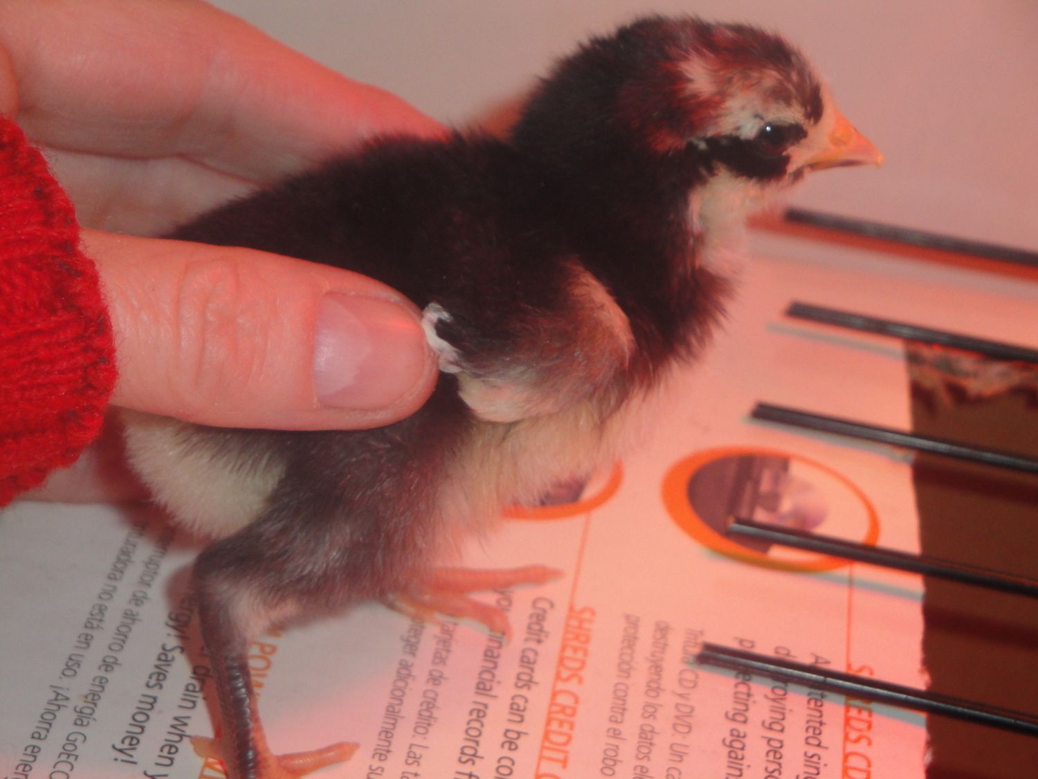 I hatched out 5 peeps last week. I am pretty sure that one is a barred rock, 2 are buffed rocks and one is a blue cochin. However, the fifth one is confusing me.