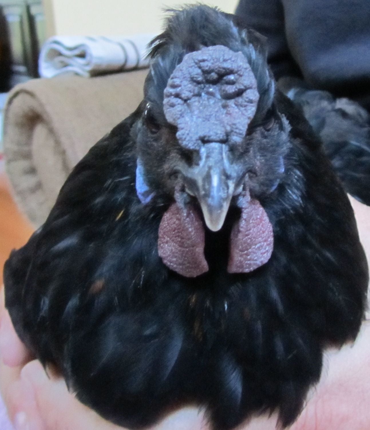 He was a Silkie crossed with something. He had every single Silkie characteristic except he was hard-feathered and had a slight orange pattern around his neck. His offspring with full Silkie hens produced a fair winning non-bearded black Silkie. He was extremely gentle, yet protective of his hens. Of all my roosters, he was the most friendly and calm.