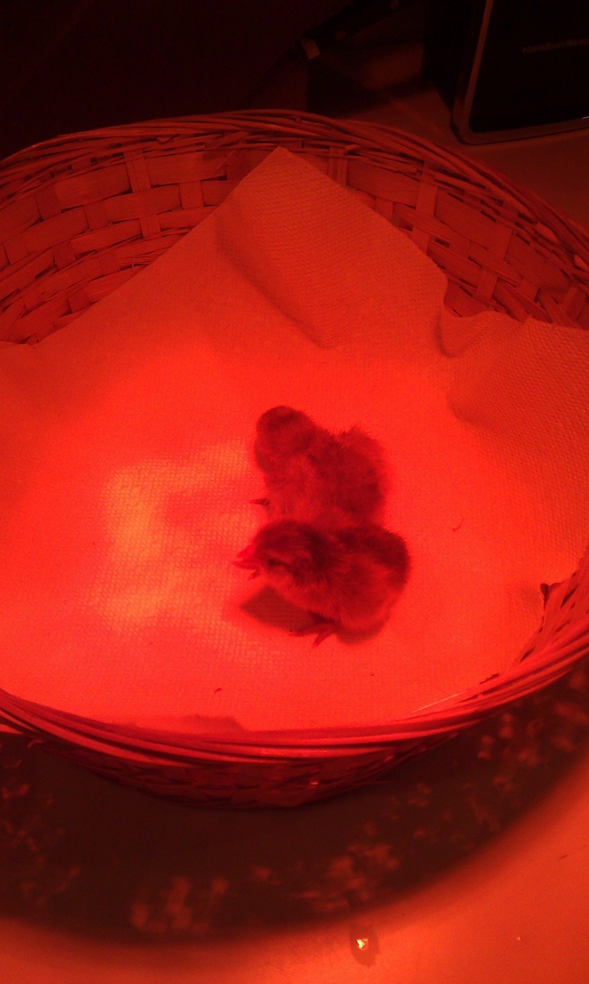 Can you put them in a small bathroom and run a space heater to get the room up to 90 degs? Don't lower the heat lamp too low because you can cook them quickly. Cook some scrambled eggs and mash up into tiny pieces for them, the added protein will help.