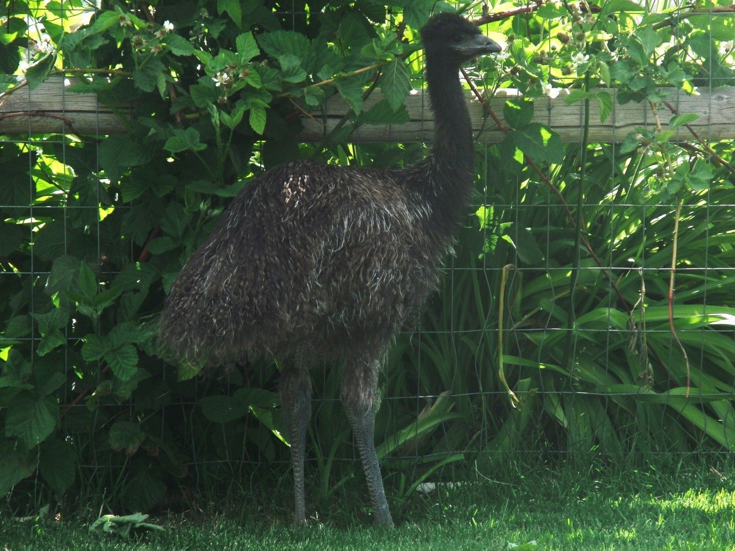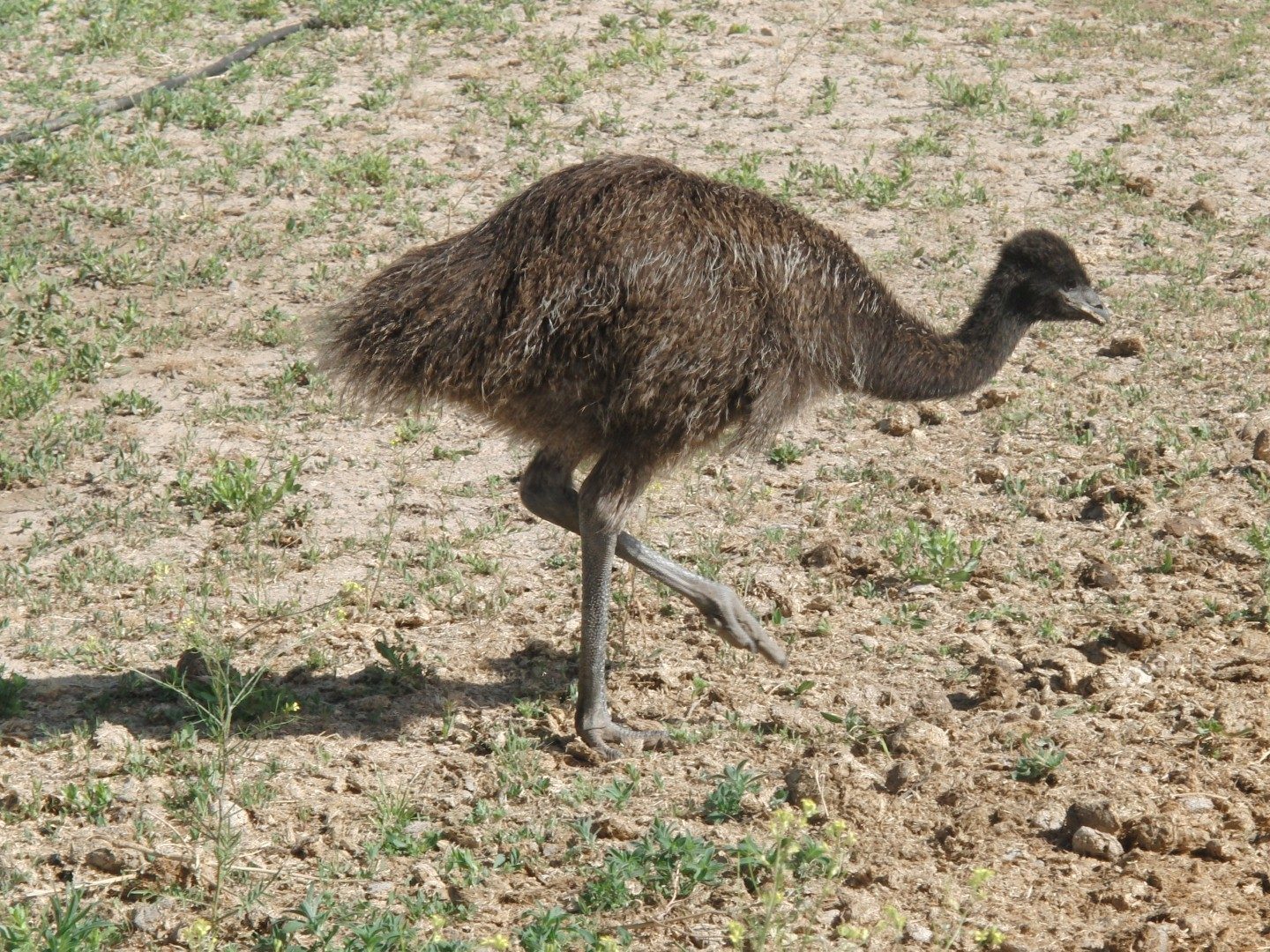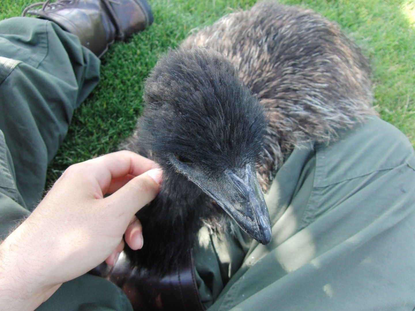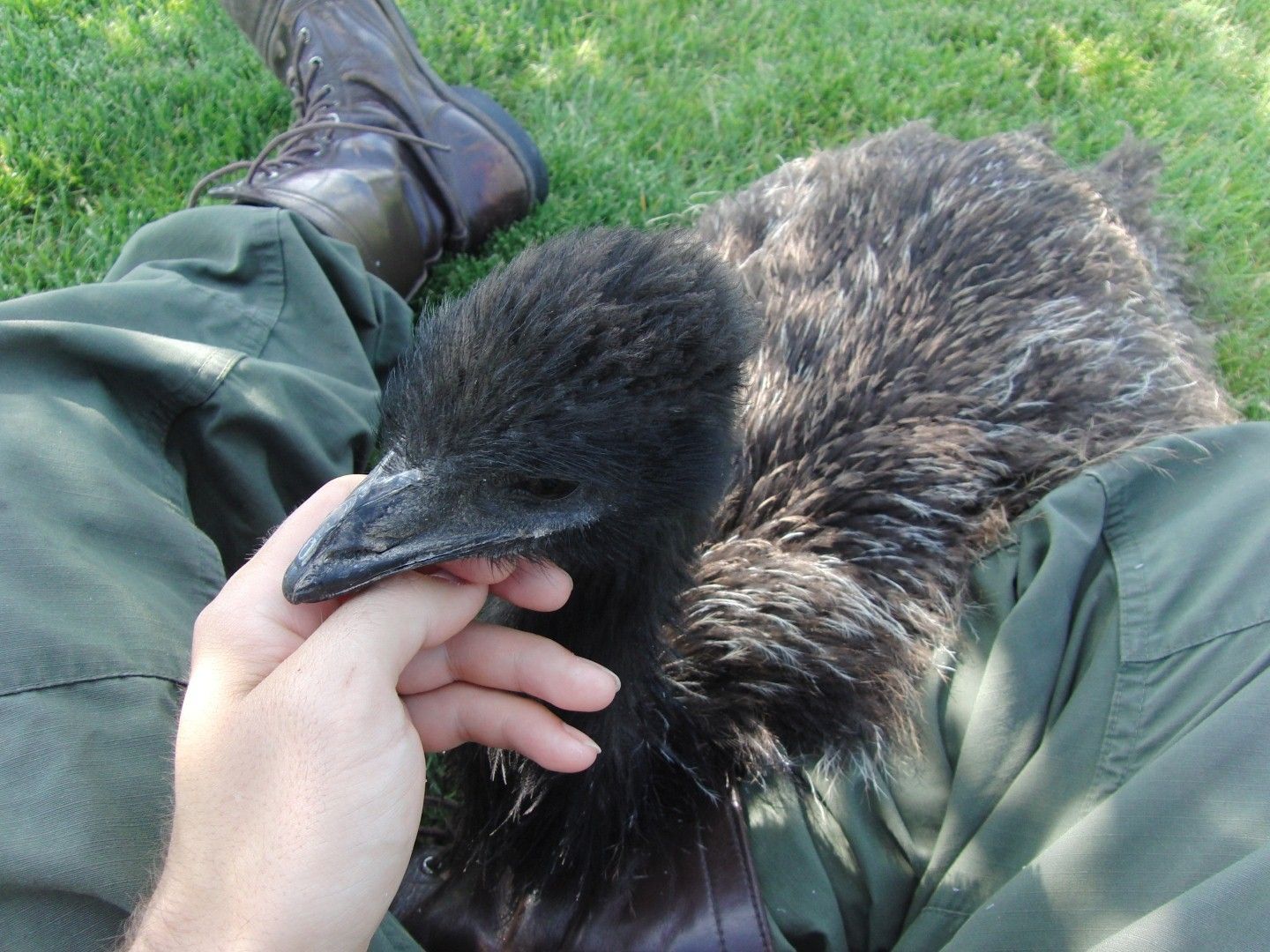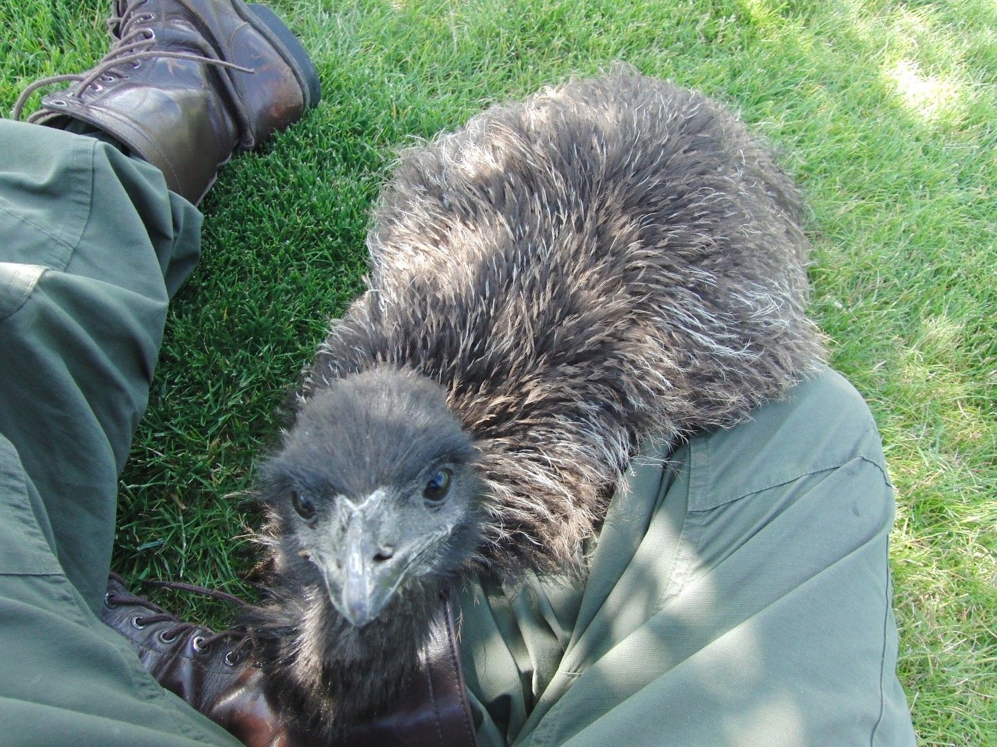 While sitting in the sun in the house-clearing, reading, I looked up to see an emu drifting through the gum trees. Behind it was what looked at first like a snake – a little black head bobbing in and out of sight. I sat very still until there was a big tree between the emu and me, then zipped over under it, to observe. The ‘snake’ was a chick no more than a week or ten days old. Just the one, and the male was walking ever so slowly to allow it to keep up. It was so small it was having trouble ploughing through eight inches of grass. This is the first time that this is happened (my chicks were about three months old when Eric the Emu brought them to the house-clearing for the first time.), and they approached to within the length of a tennis court. I was thrilled. It’s only the fact that ‘my’ emus interact with the wild emus (and the fact that there are no dogs or cats here) that allows the house-clearing to be on the wild emu’s ‘map.’ I saw them three times in all. Supreme Emu