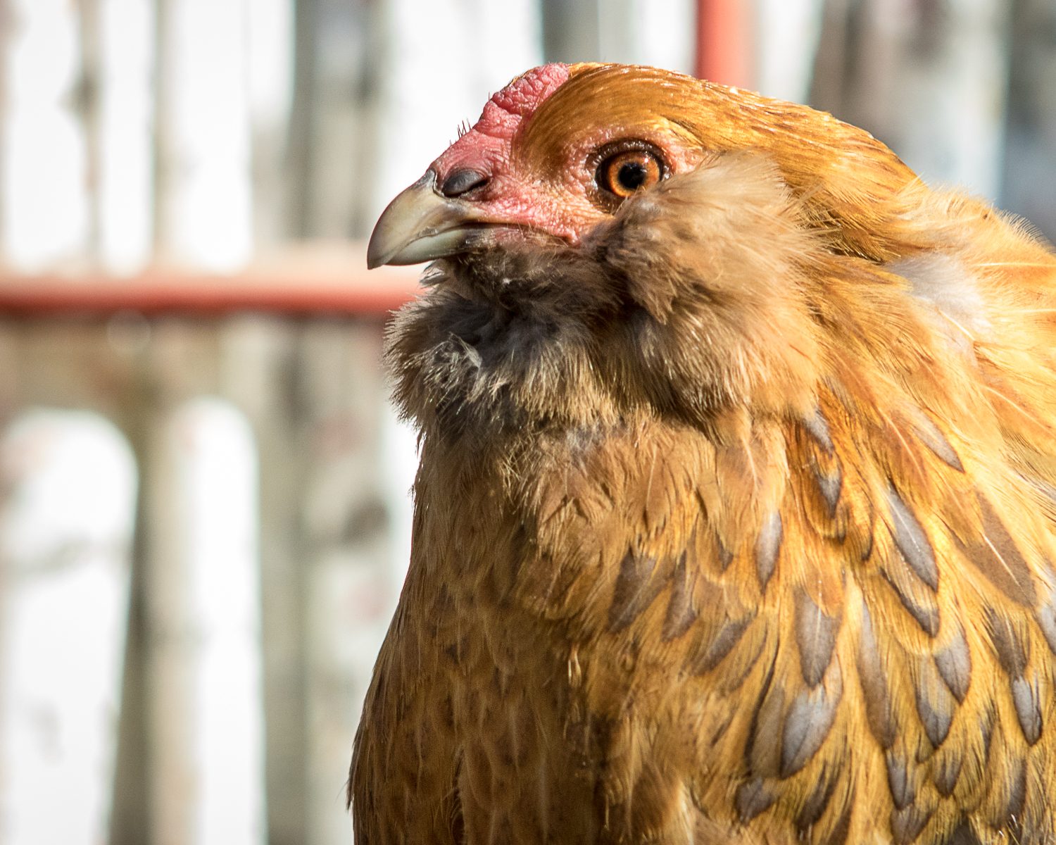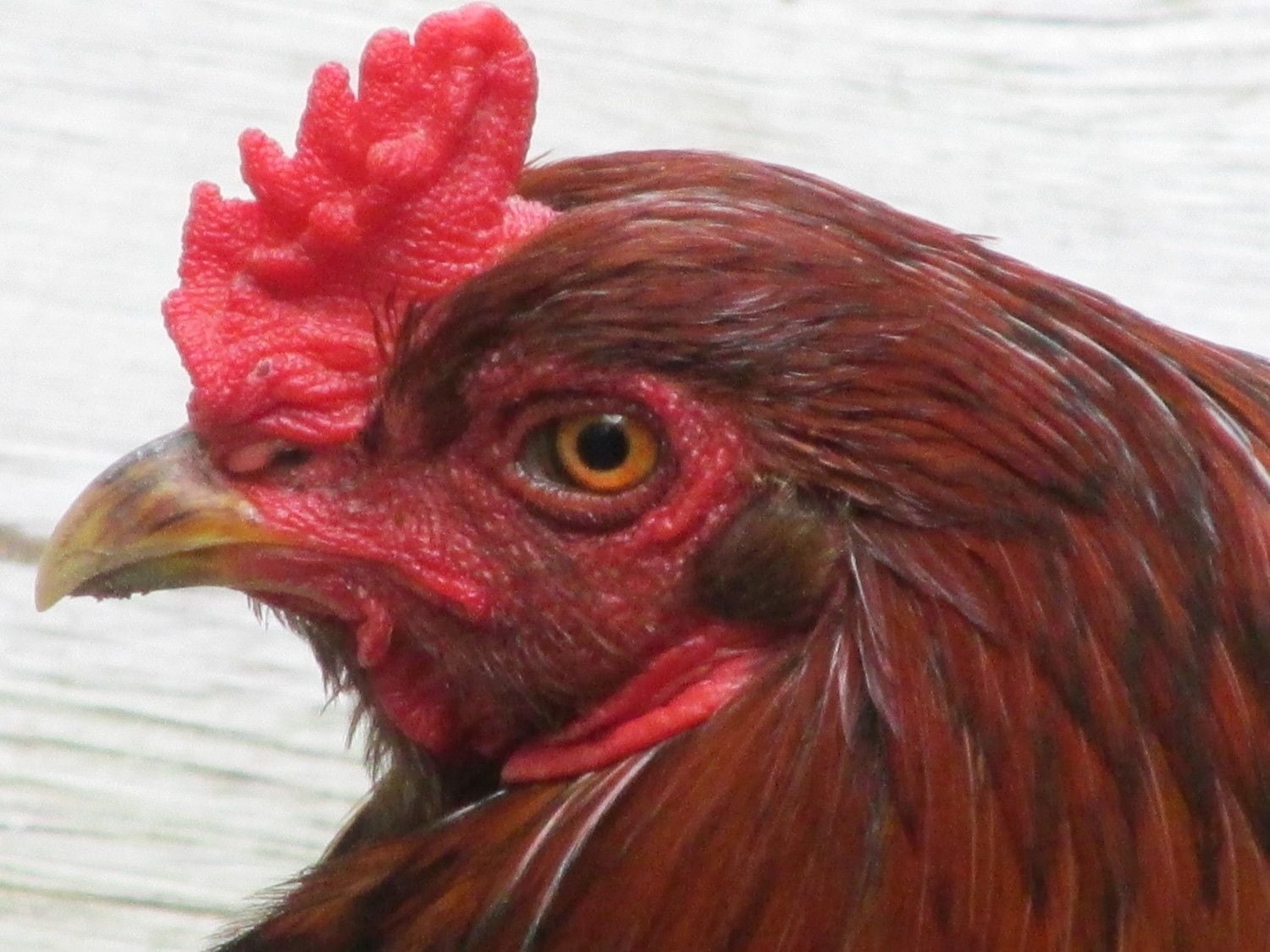 Smudge (so named because she was just a dark grey puff-ball as a chick--now she is golden and lavender-grey and very lovely, but the name stuck) Easter Egger hen, about 9 months old in this pic.