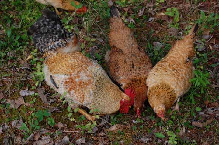 My darkest boy is on the left - he really has a lot of red barring starting to show up. They were all "helping" me prepare my gardens for planting lol! There are a couple of my Lavender Ameraucanas in the background.
