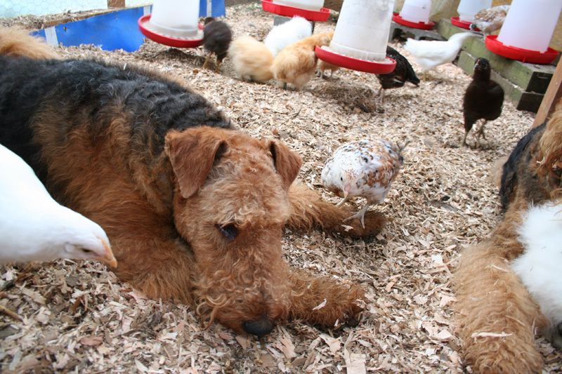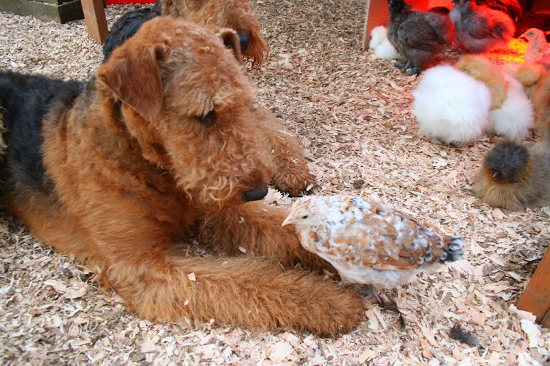 I have a mixed flock, for eggs, for fun, for yard ornaments and for pets. So I needed a breed that was friendly and got along with everyone. That included my guard dogs, Airedale Terriers, Kimi and Rummy. These dogs helped raise the chickens and spent a heck a lot of time raising them as chicks and then later guarding them out in the property against hawks and other predators. My property is fenced in. So don't be alarmed with the following photos, I'm not trying to upset or traumatize the chickens, this is normal for us.