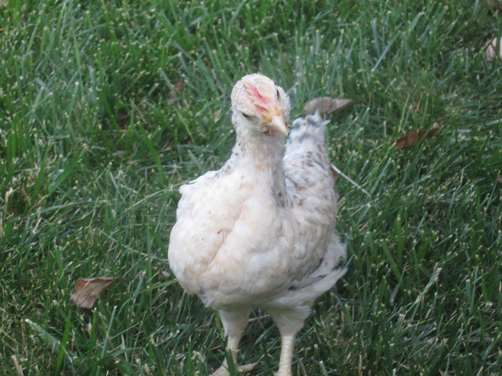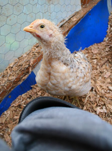 The thing about these guys is they behave differently from other breeds I have raised. The one Cockerel that likes to go with me to get food was perched on my arm. He started to fall and latched onto my glasses to hold on(the glasses were clipped to my shirt). He did not chirp or complain, just steadied himself. He did this several times. When I set him down by the feed bag, he happily staid there, eating a bit of the spilled feed. When the feeder was full, he jumped onto my arm and I took him to the hutch and put him back in.Love your pictures Shiela. I have a few of those calico-looking birds too, still waiting for them to announce whether a pullet or cockerel. No one has bitten me (yet), and I have a few that are very friendly, to the point of enjoying being picked up and petted. Others seem more wary, but still curious.