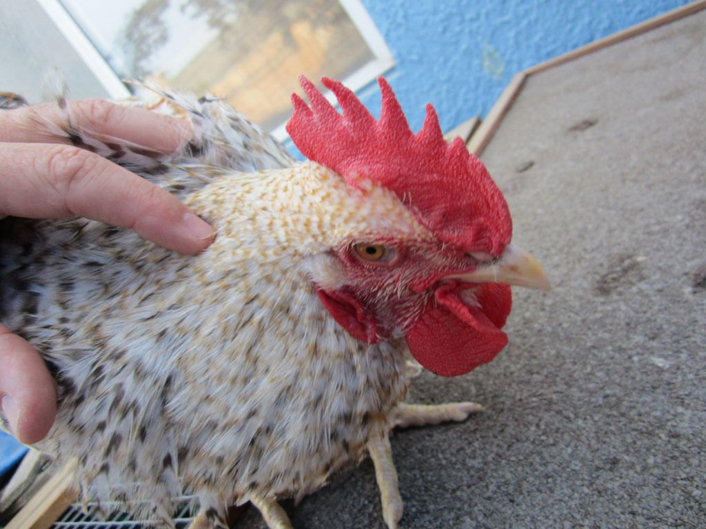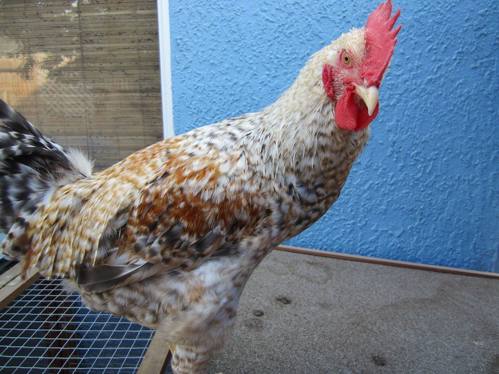 Here's my other possible guy from the Skyline birds. Way too dark, but more even comb, decent size compared to the others, yellow legs, a bit assertive. Longer tail feathers, but just as pinched.