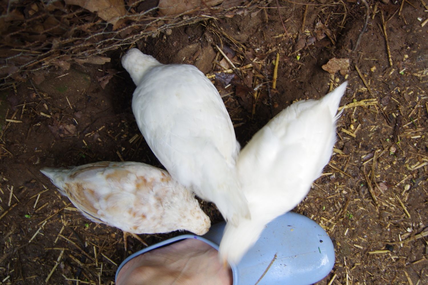 Rosie's three chicks together - the pullet and two recessive white males. They are still little compared to the hand-raised group, but from what I've seen, I bet they will at least mostly catch up, and we know it's environmental, not genetic.
