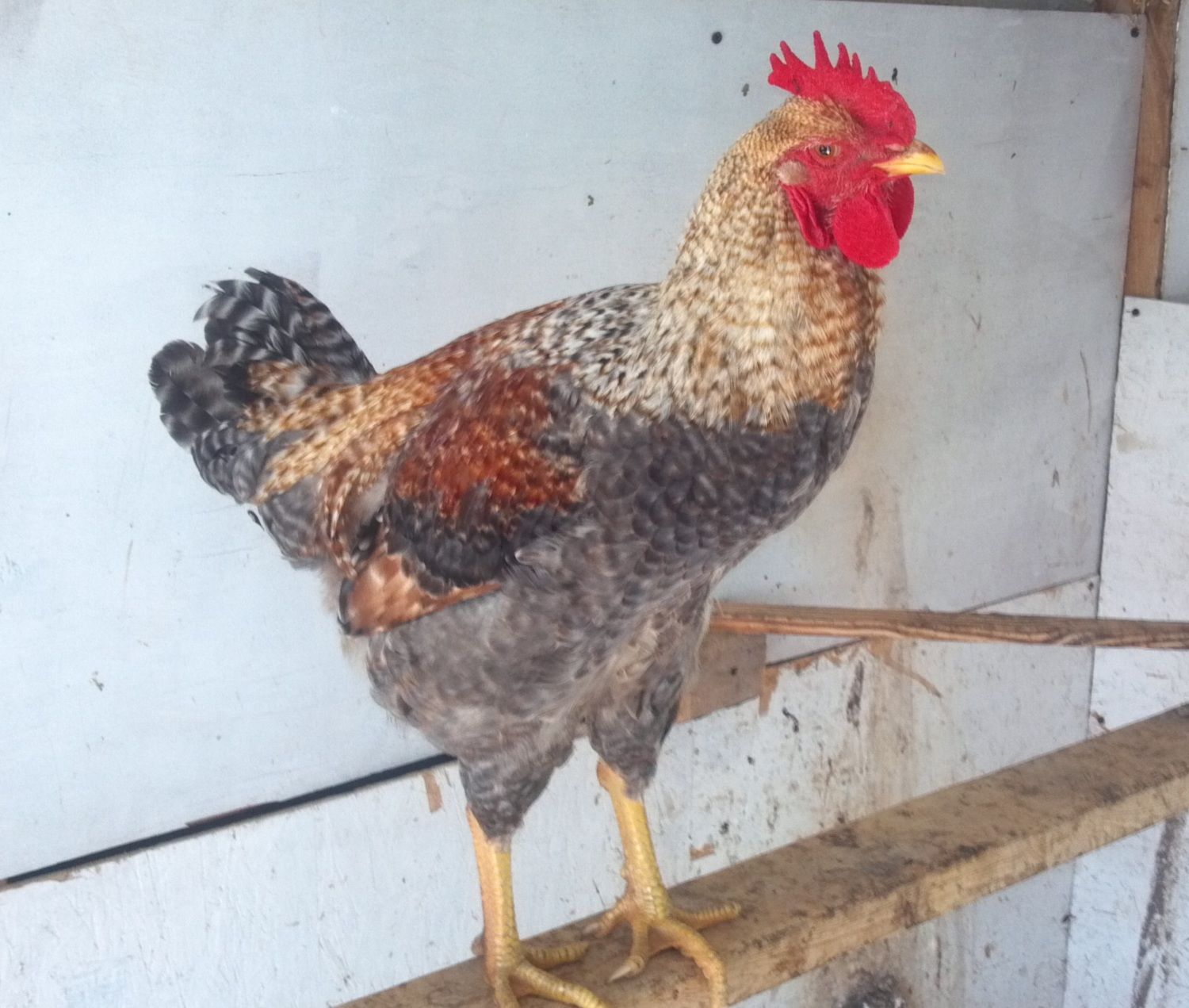 The picture is a bit dark- he actually doesn't have any black on him, only a charcoal/dark brown. I love his coloring. His tail is at an odd angle in the pic because he was unhappy about being cornered for a portrait lol! He's been a little skittish since being reintegrated into the flock. Poor thing.