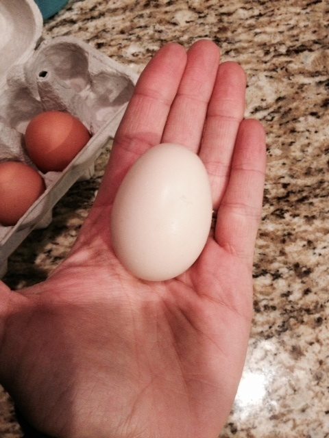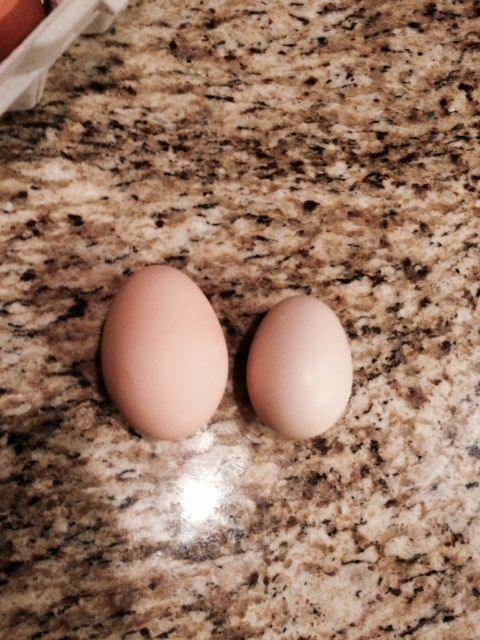 Hi! I'm new to the EO world, but already realize the specialty of this breed and its wonderful characteristics. Here's what happened...was just looking for some more chickens to add to our flock and came across a breeding trio of EO. The poster said she had gotten and hatched them from greenfire farms. After a bit of research I said to DH, lets go pick these babies up! We have since fallen in love with the breed. Here are some pics of our roo and his 2 gals. Please, all opinions welcome. Now, we have also acquired 5 2-1/2 week old chicks (still unsexed). And now for the best news...we got our FIRST Egg On Thursday 11/28!! They are just about 6 months old. And today, we got our second egg. It's so exciting. I'm almost positive they are fertilized because I've seen the roo doing his thing. We don't have an incubator yet but we will soon! These pics are from when we first got them (1.5 months ago)and after looking I am realizing how much the roo has filled out so much already. His tail feathers are really coming in now and he's just so handsome. Friendly, will eat out of my hand yes protective of his girls. He needs a name too - suggestions welcome! The egg is the smaller one on the right.