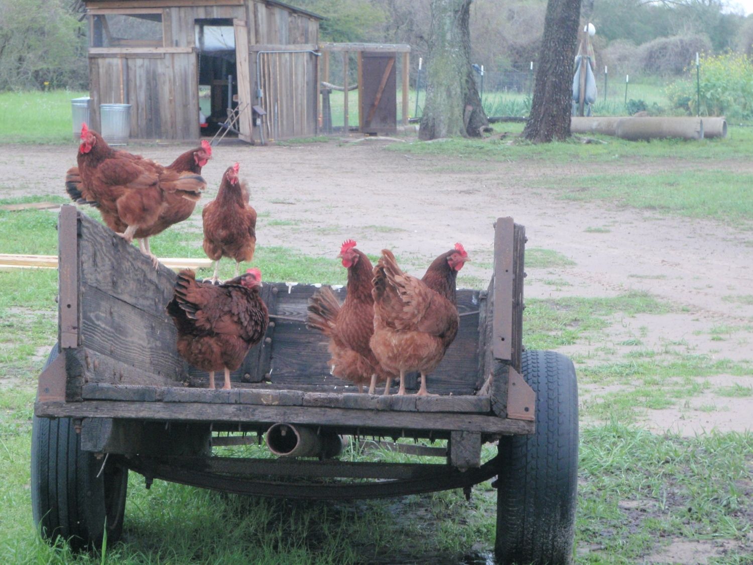 I like the photo. It looks like your chickens are wondering how to drive that the "wagon."